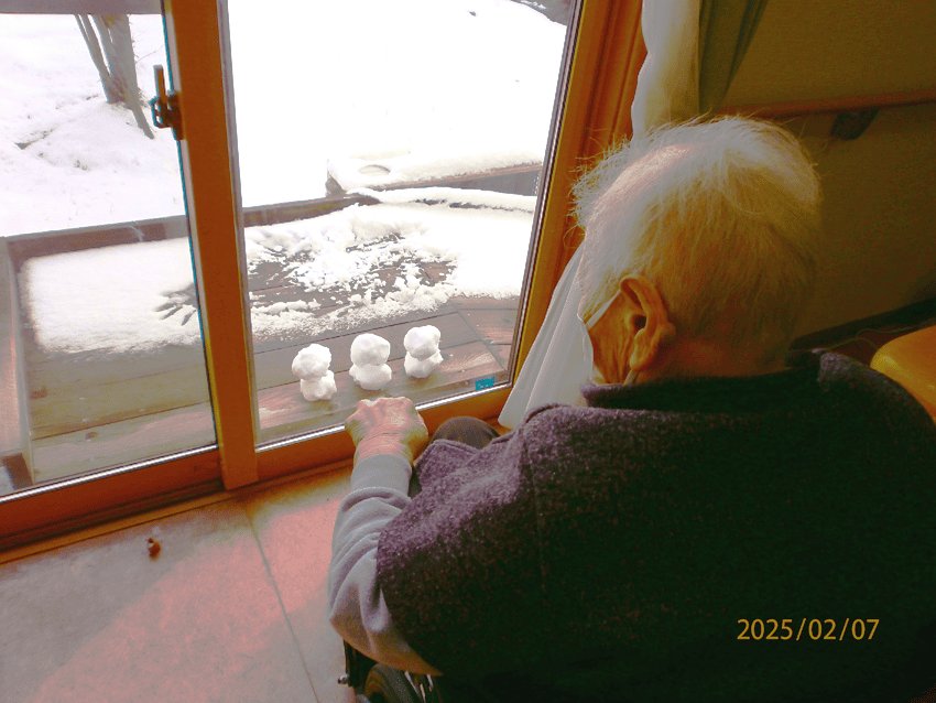 『今年は雪が少ないのかなぁ』なんて考えていたところ、2月の初めに雪が降りました。職員にとっては雪掻きや雪掻きや雪掻きや……。朝早くから除雪しなくちゃと思うところですが、入居者様方は『降ったわねぇ』『雪掻きしなきゃ』『きれいな景色ねぇ』等様々な反応が見られます。