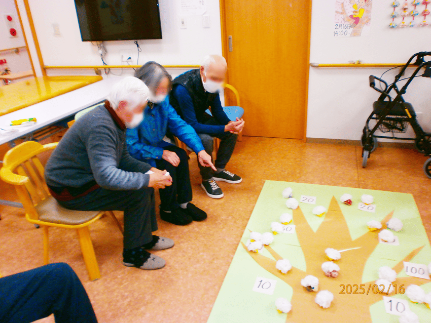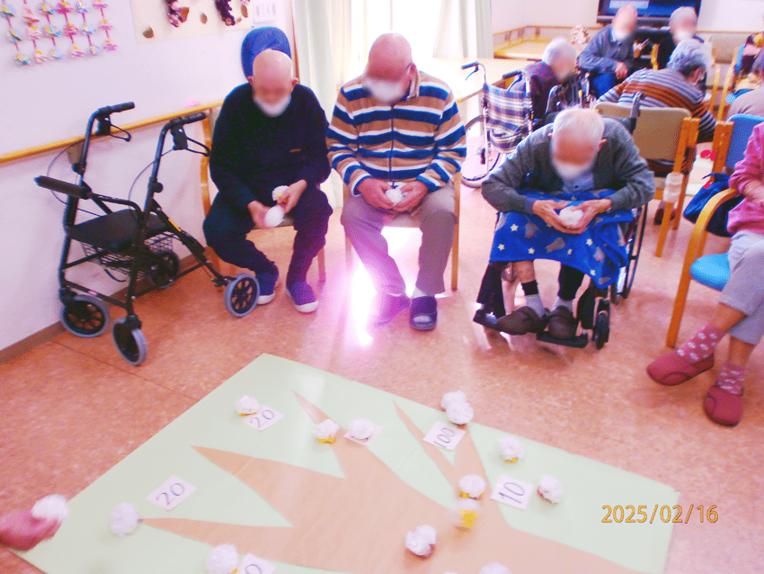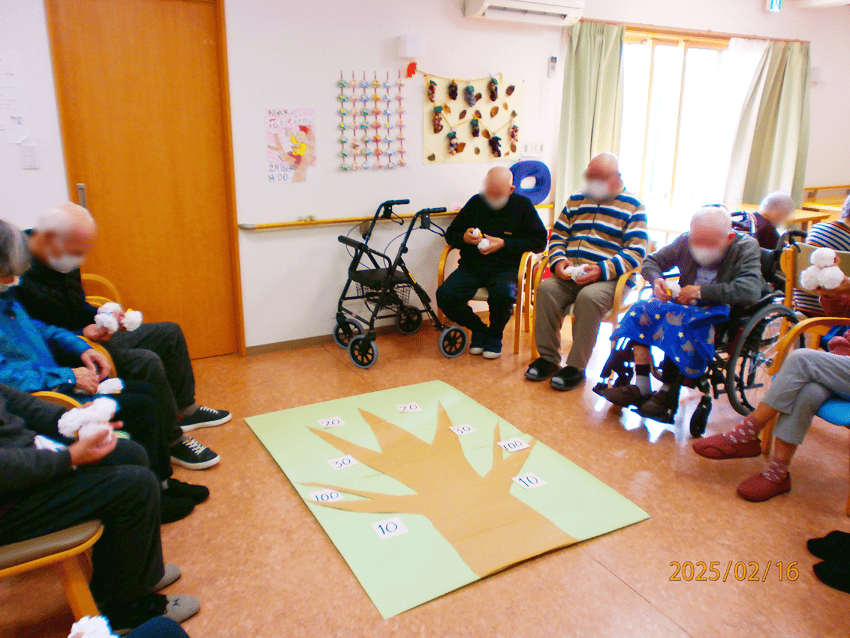 こすもす園ではいち早く春を迎えたく「枯れ木に花を咲かせましょう」と題し、2チームに分かれ得点で競うゲーム形式で2月の行事をさせていただきました。