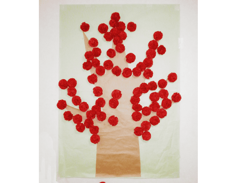 後日、利用者様が使用した花を的に貼付け壁に飾り、満開に咲いた花を眺め春を感じて頂いています。