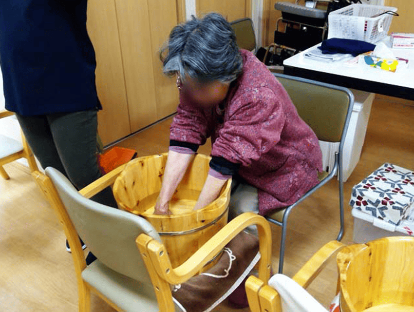 早速入居者様に体験していただきました。「いい香りだね」「きもちいい」とたくさんの笑顔が見られました。