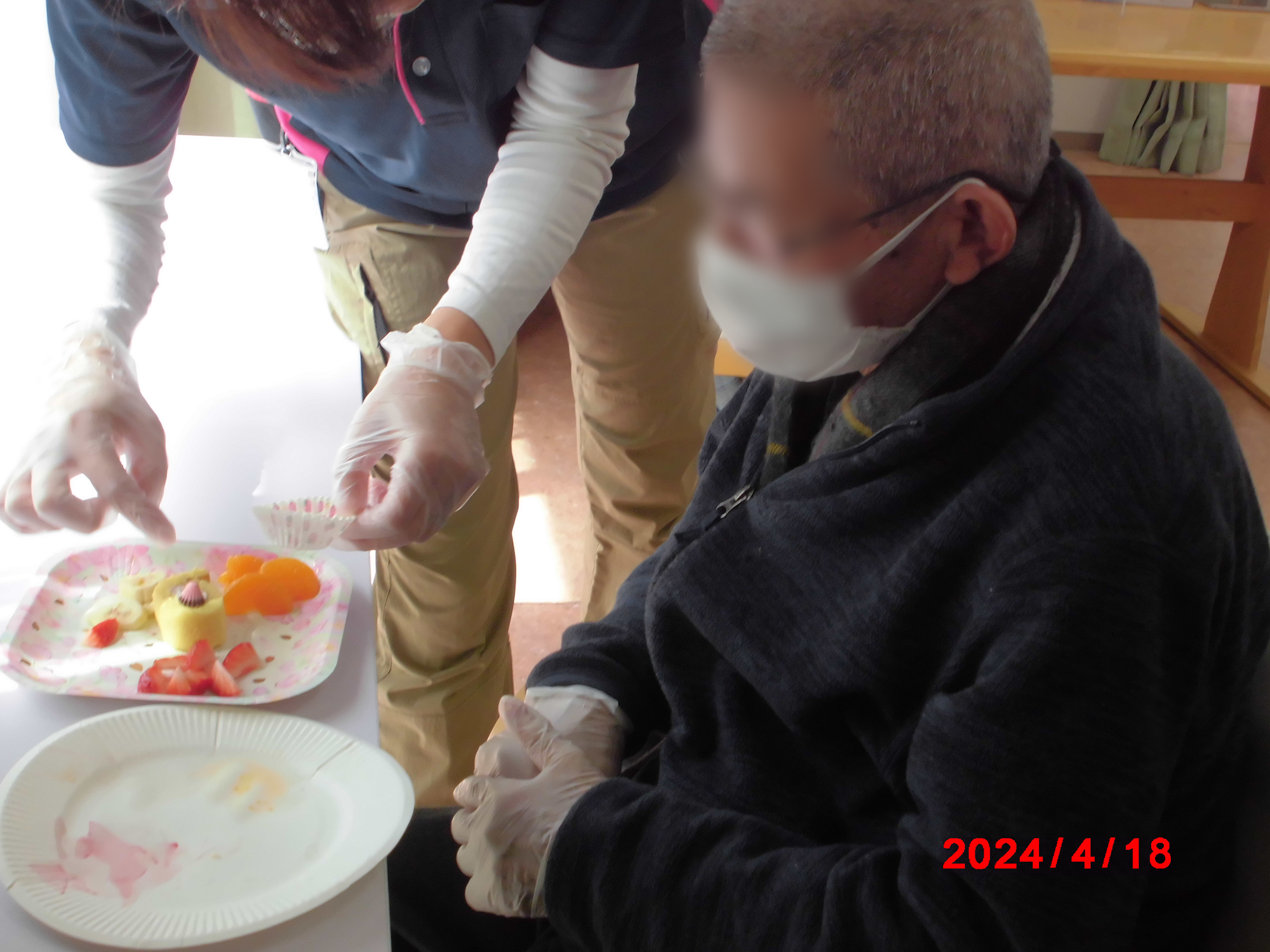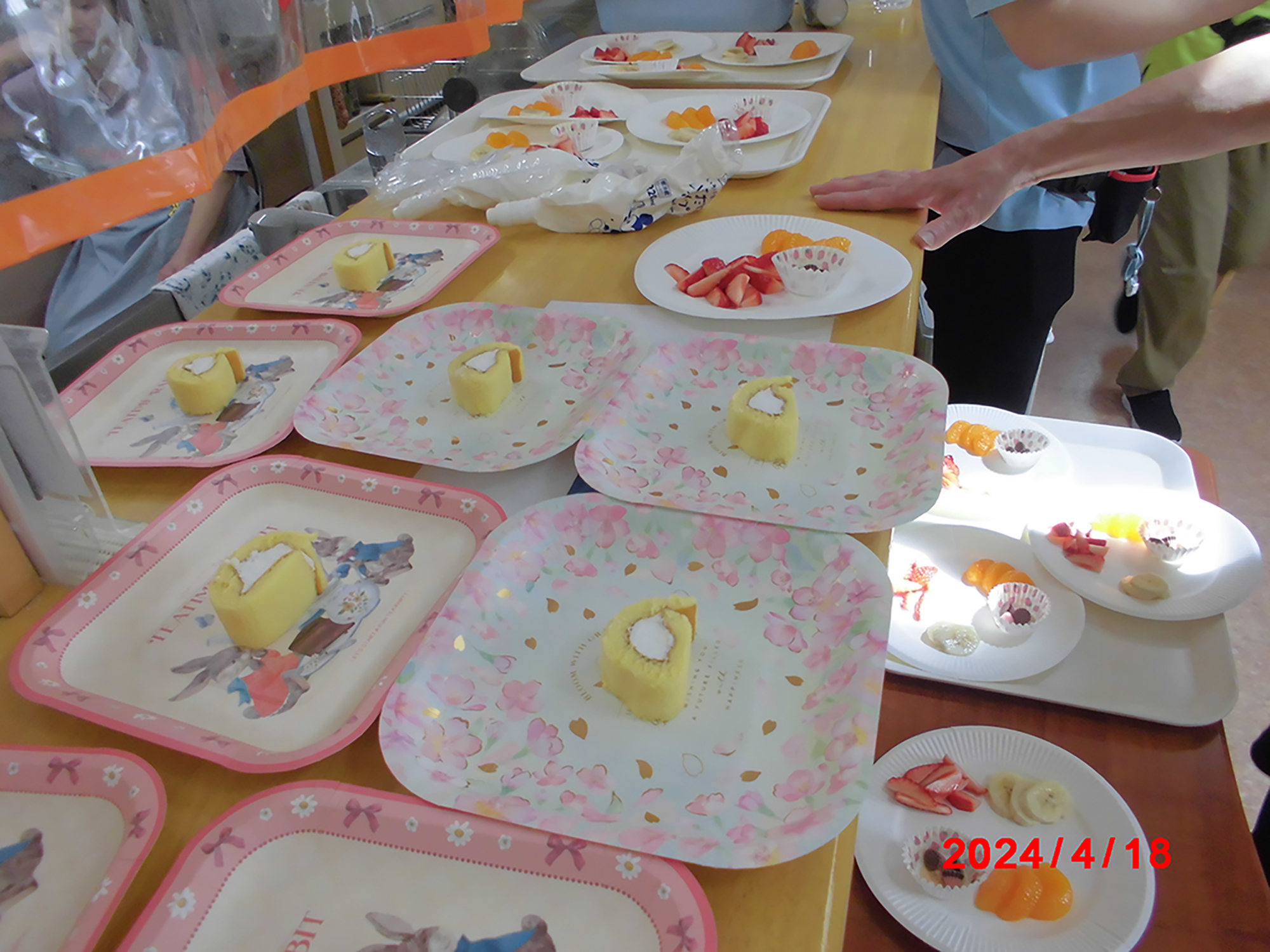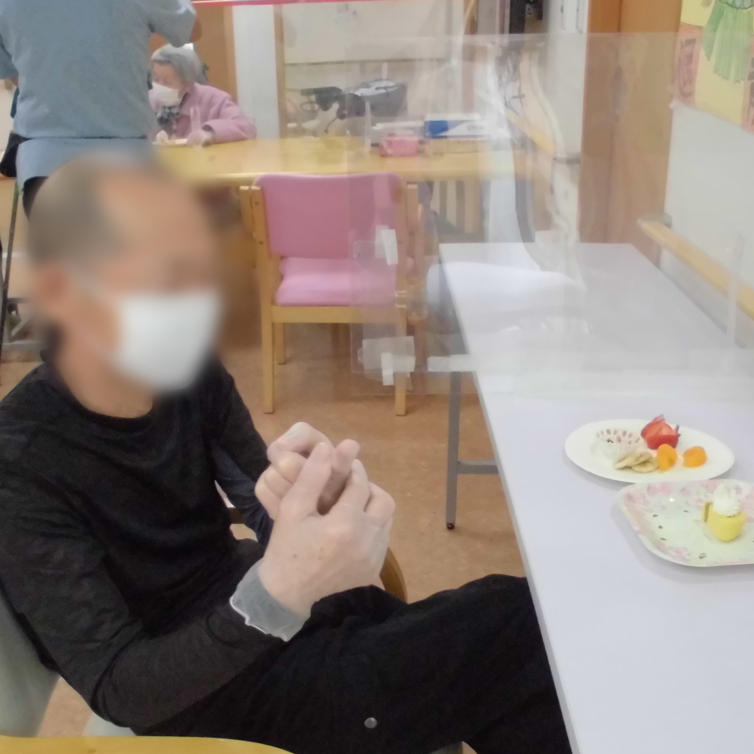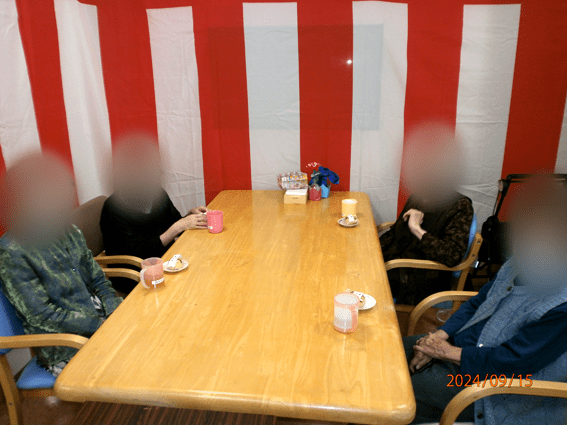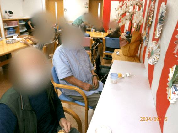 食事の時間になると、「あらぁ!素敵!」「おいしいわぁ!」「お彼岸だね?」等々うららかな声が上がりました。I様の誕生日だと伝えると、「おめでとう~」の声に!