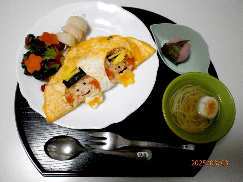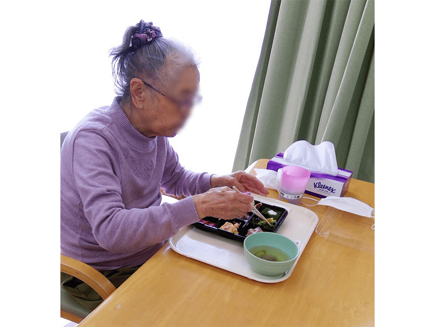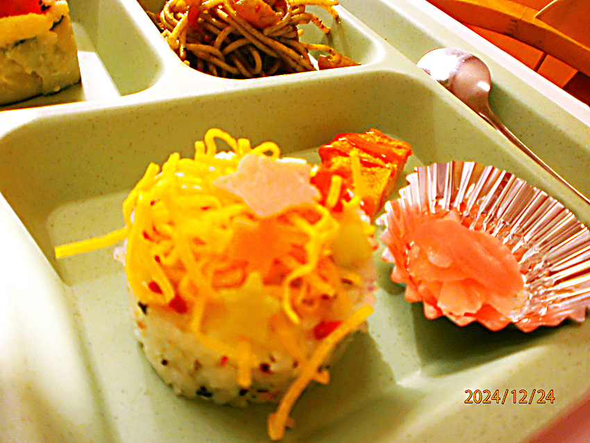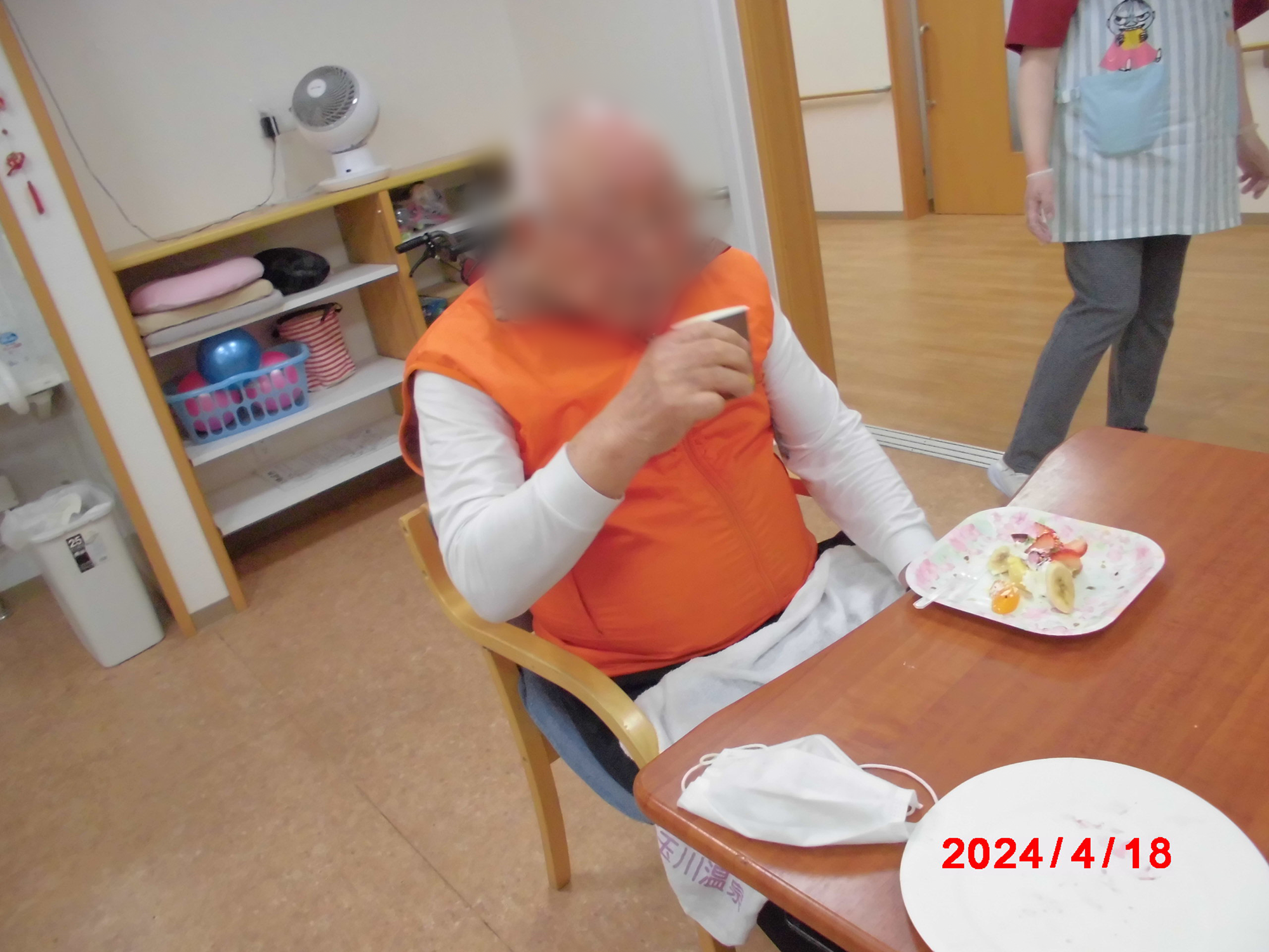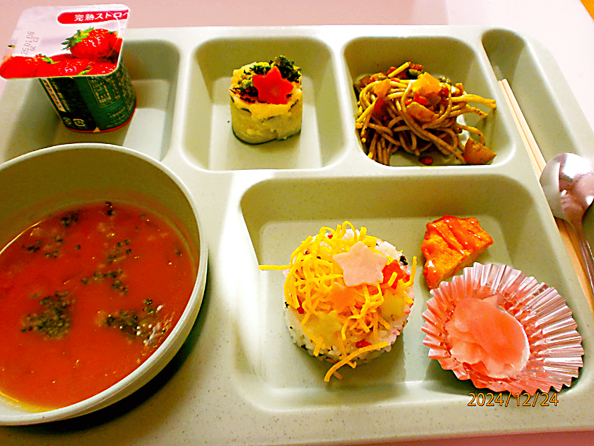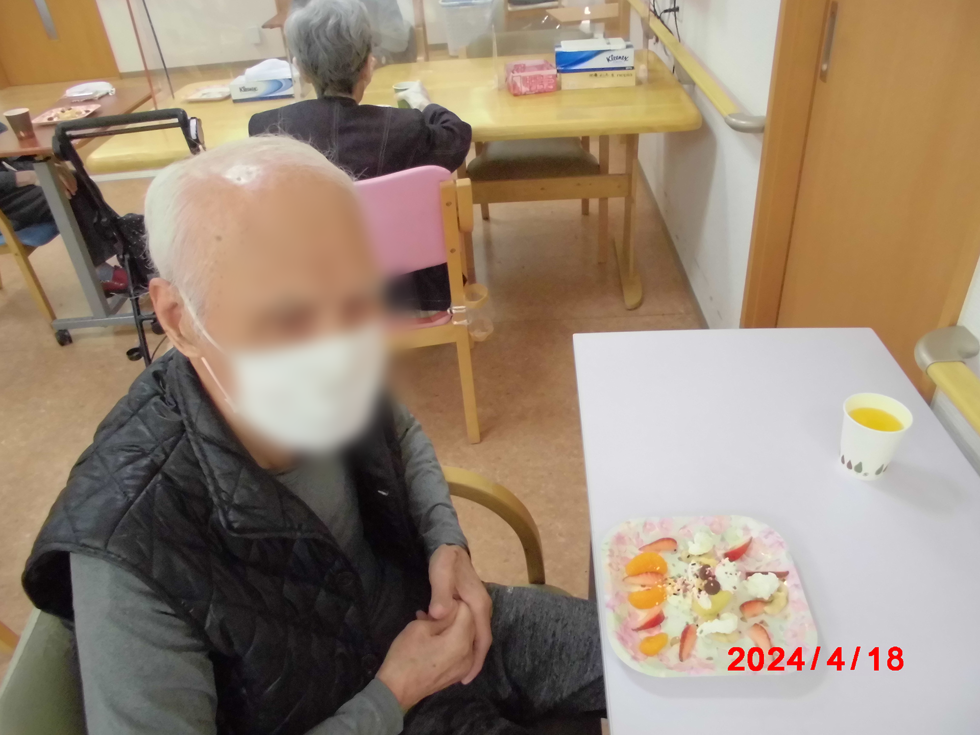食事の時間になると、「あらぁ!素敵!」「おいしいわぁ!」「お彼岸だね?」等々うららかな声が上がりました。I様の誕生日だと伝えると、「おめでとう~」の声に!
