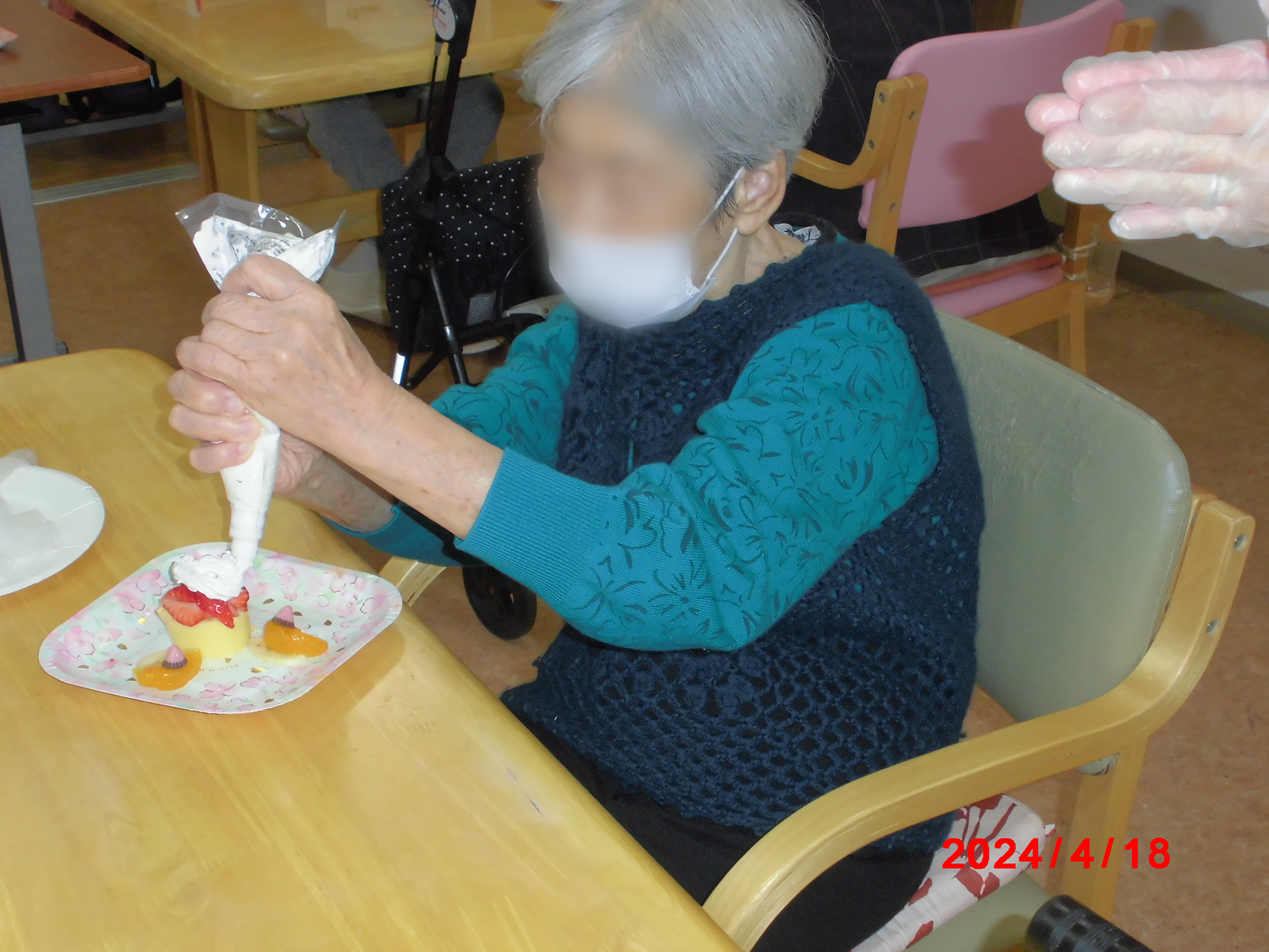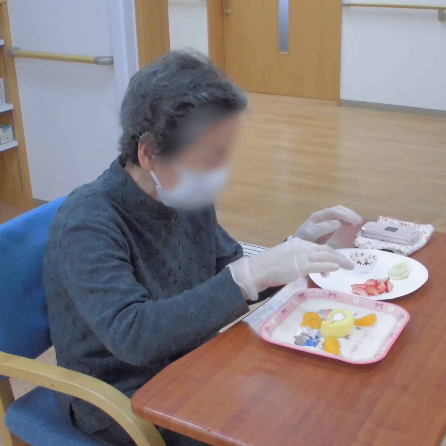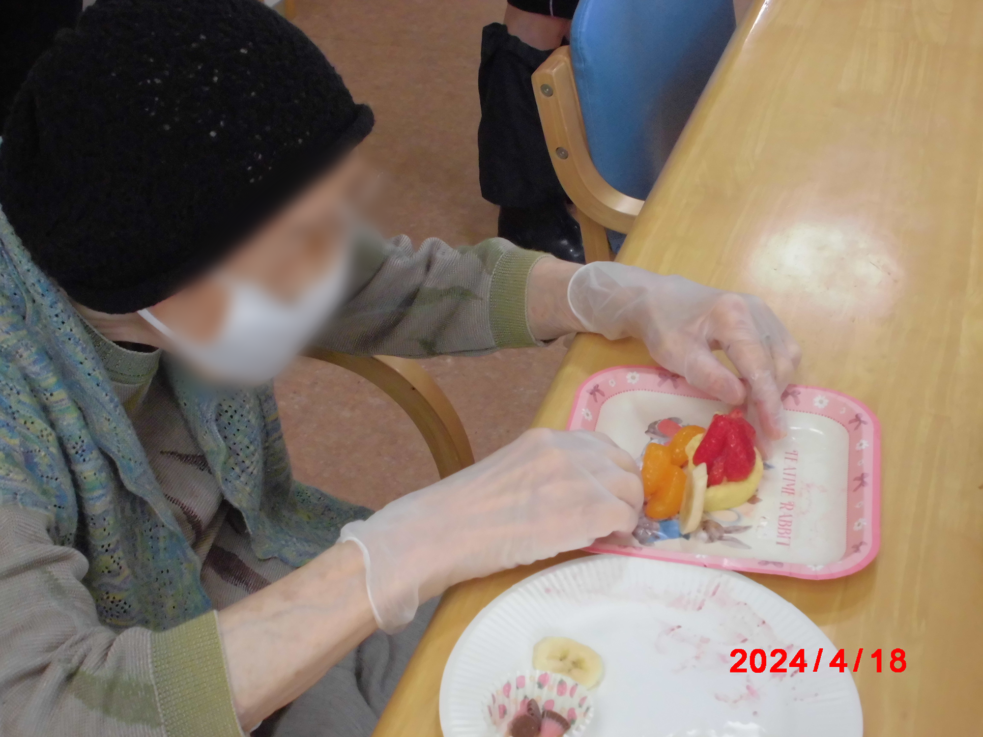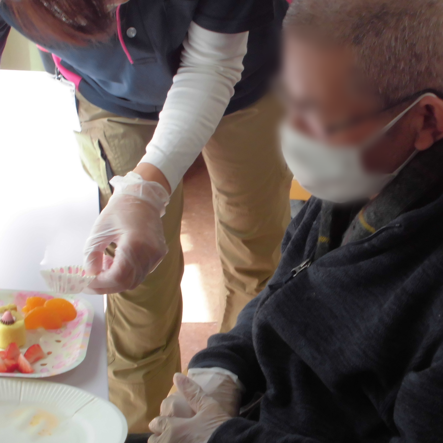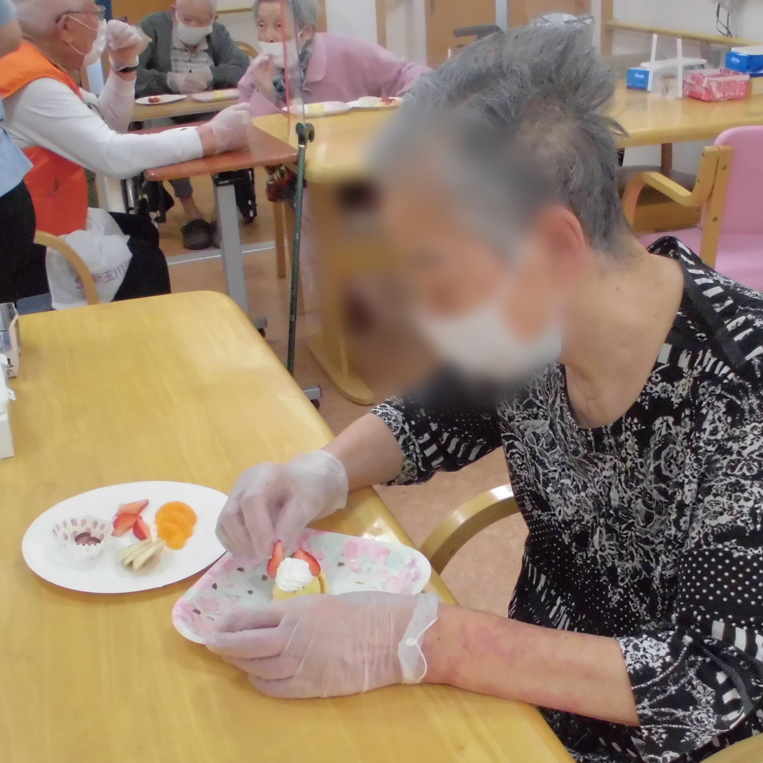 当日、ロールケーキにイチゴやミカン、バナナ等のフルーツやチョコレートをホイップクリームと飾りつけしていただき、全員揃っての楽しいおやつの時間となりした。
