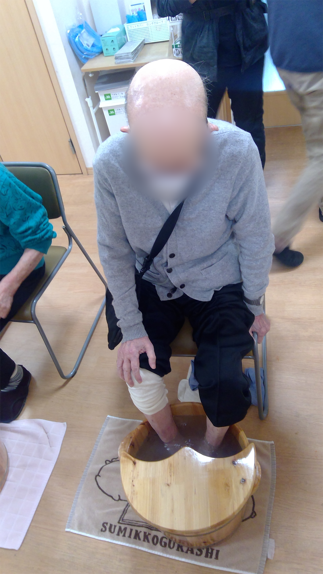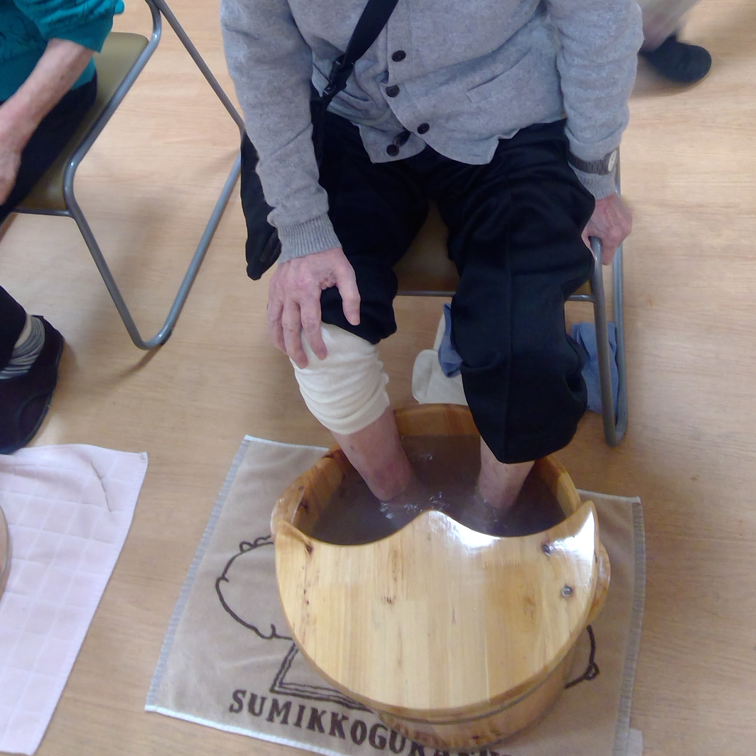 足湯には全身浴と比べ心臓への負担も少ないため、高齢者にはお勧めです。脚が温まり全身の血液のめぐりがよくなります。老廃物の排泄がスムーズになることは、むくみの改善にも繋がります。