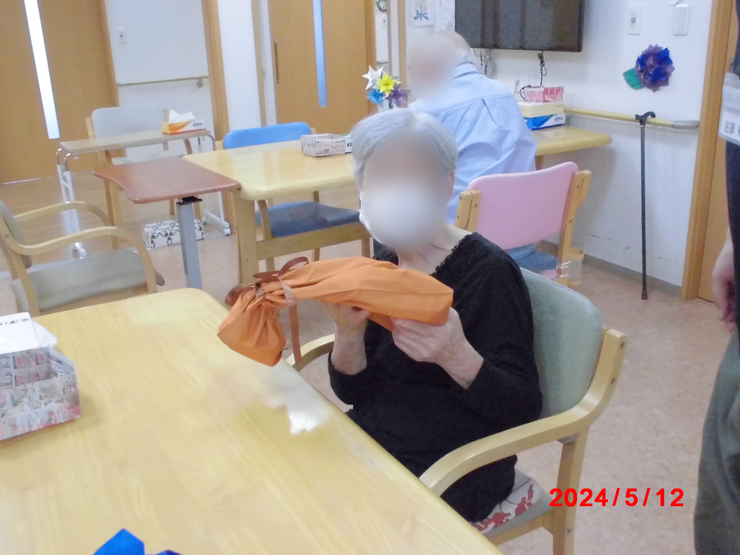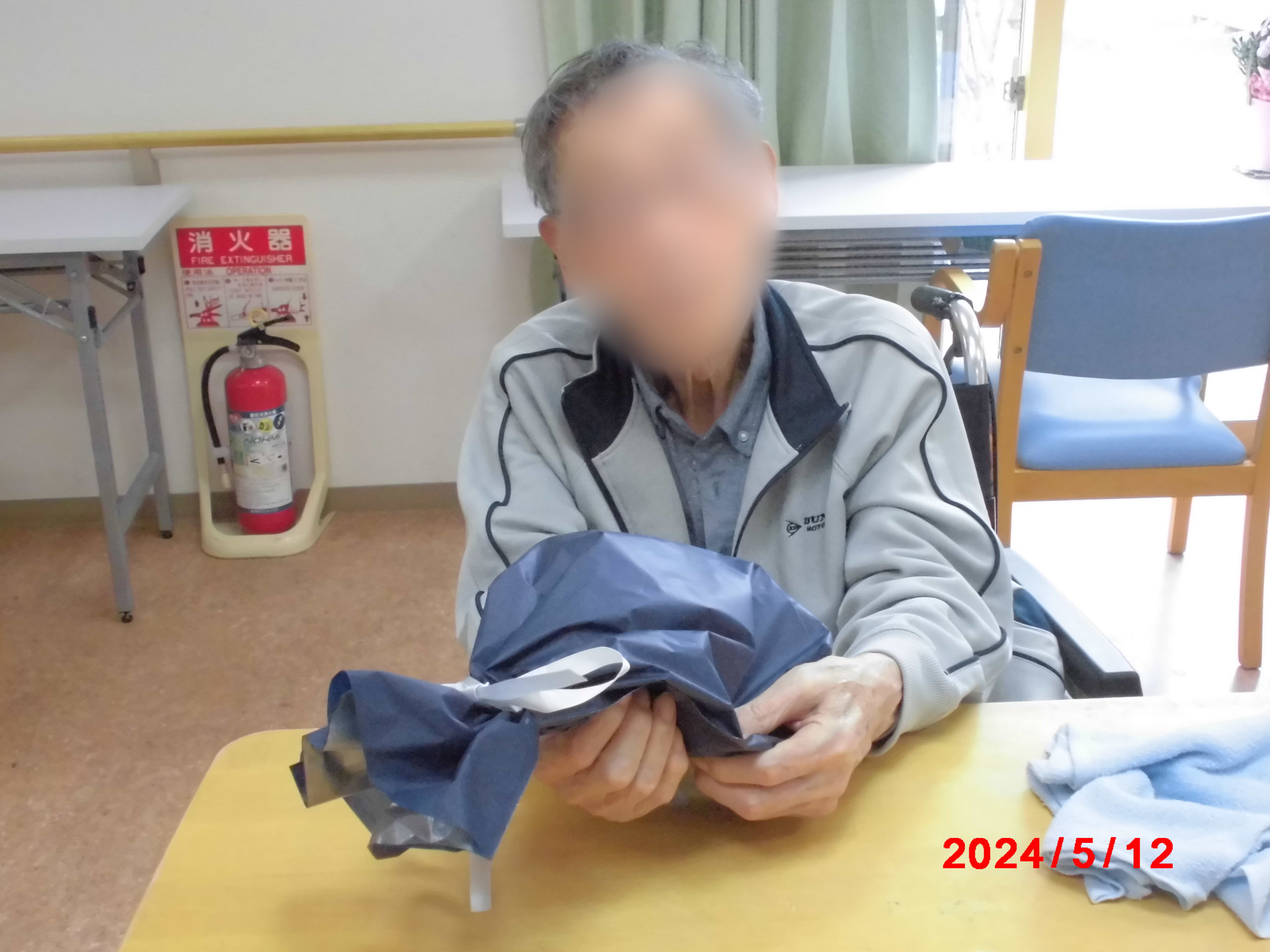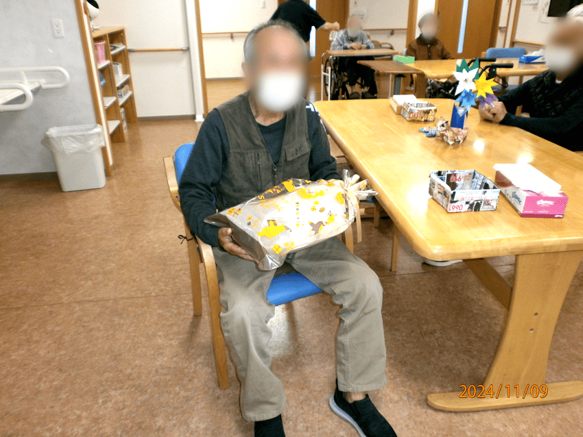 H様も初めてのこすもす園の誕生会、プレゼントを渡すと「こんなの初めてだぁ」と、少し照れ臭そうに笑っていらっしゃいました。Y様にはご夫婦の写真が入った写真立てやクッション。実はこのプレゼントは介護士の子どもたちが選んだプレゼントでした。とても喜んでくださり「お子さんによろしく伝えてね」と微笑まれていました。
