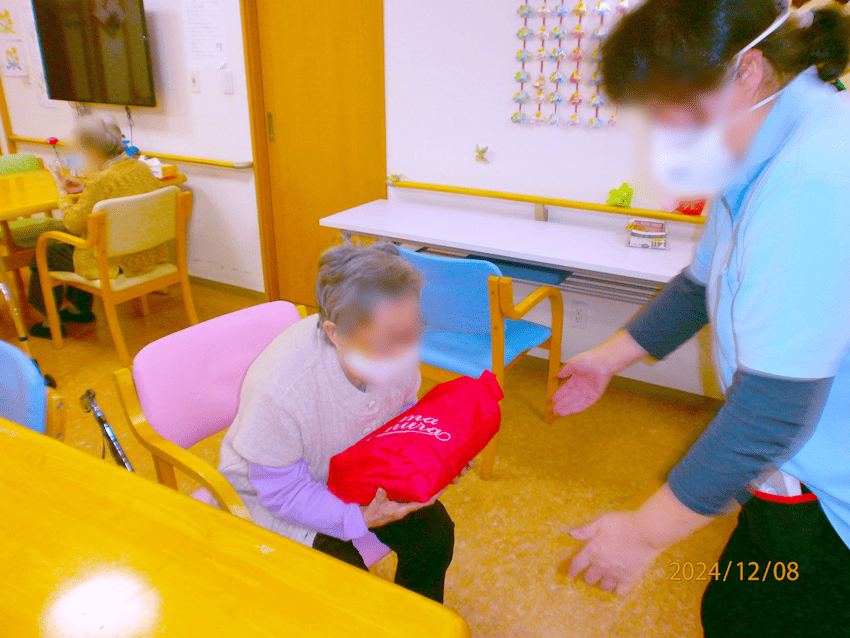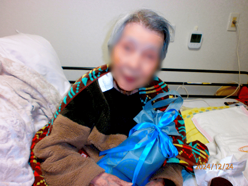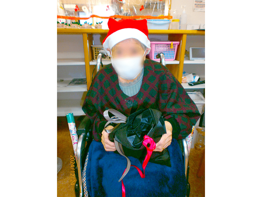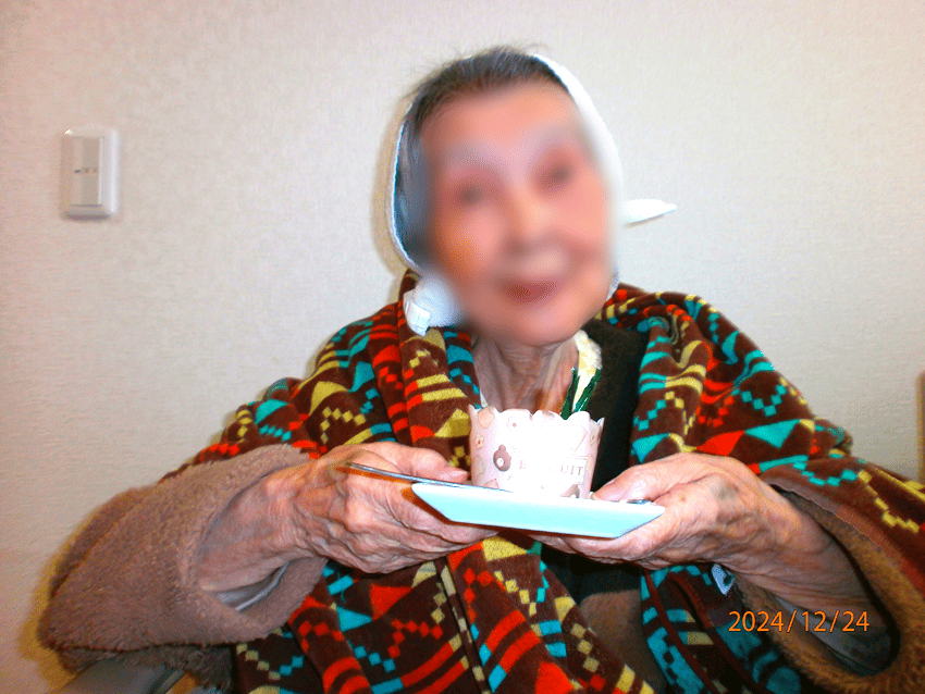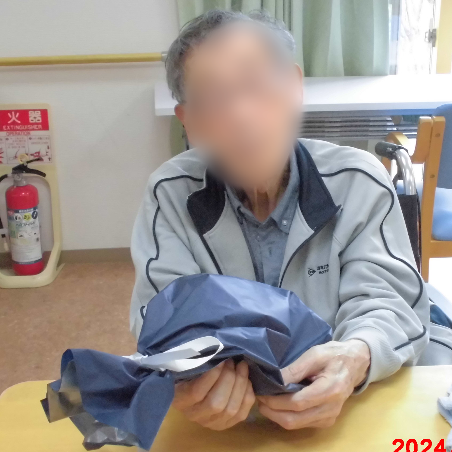 12月8日、こすもす園12月お誕生会が行われました。今月はS様お一人のお誕生会でした。S様は入所して初めての誕生会。プレゼントを受け取ると涙を流して喜ばれました。プレゼントはひざ掛け。こんなに喜んでいただけるとは!! 職員も感激してしまった誕生会でした。