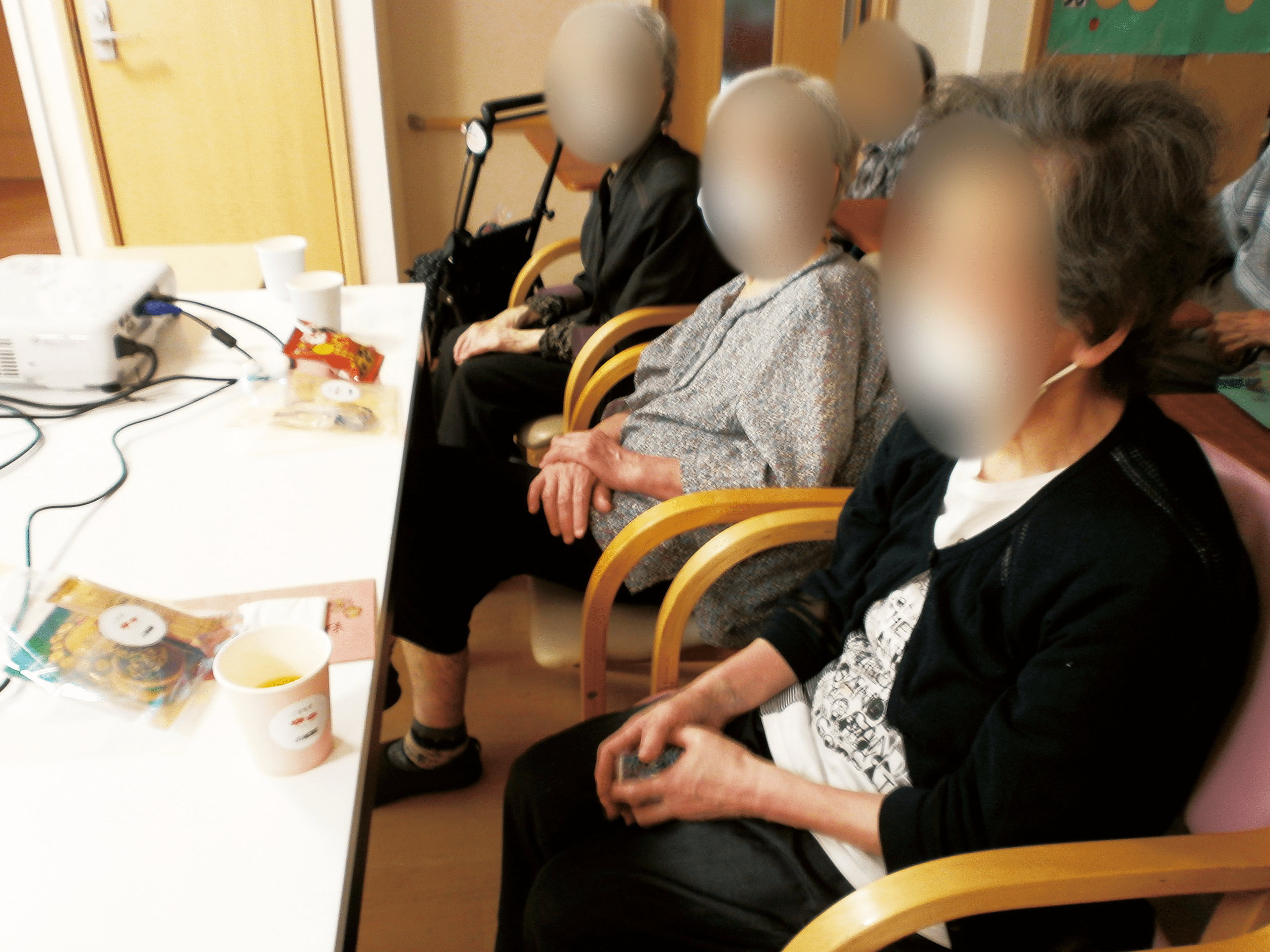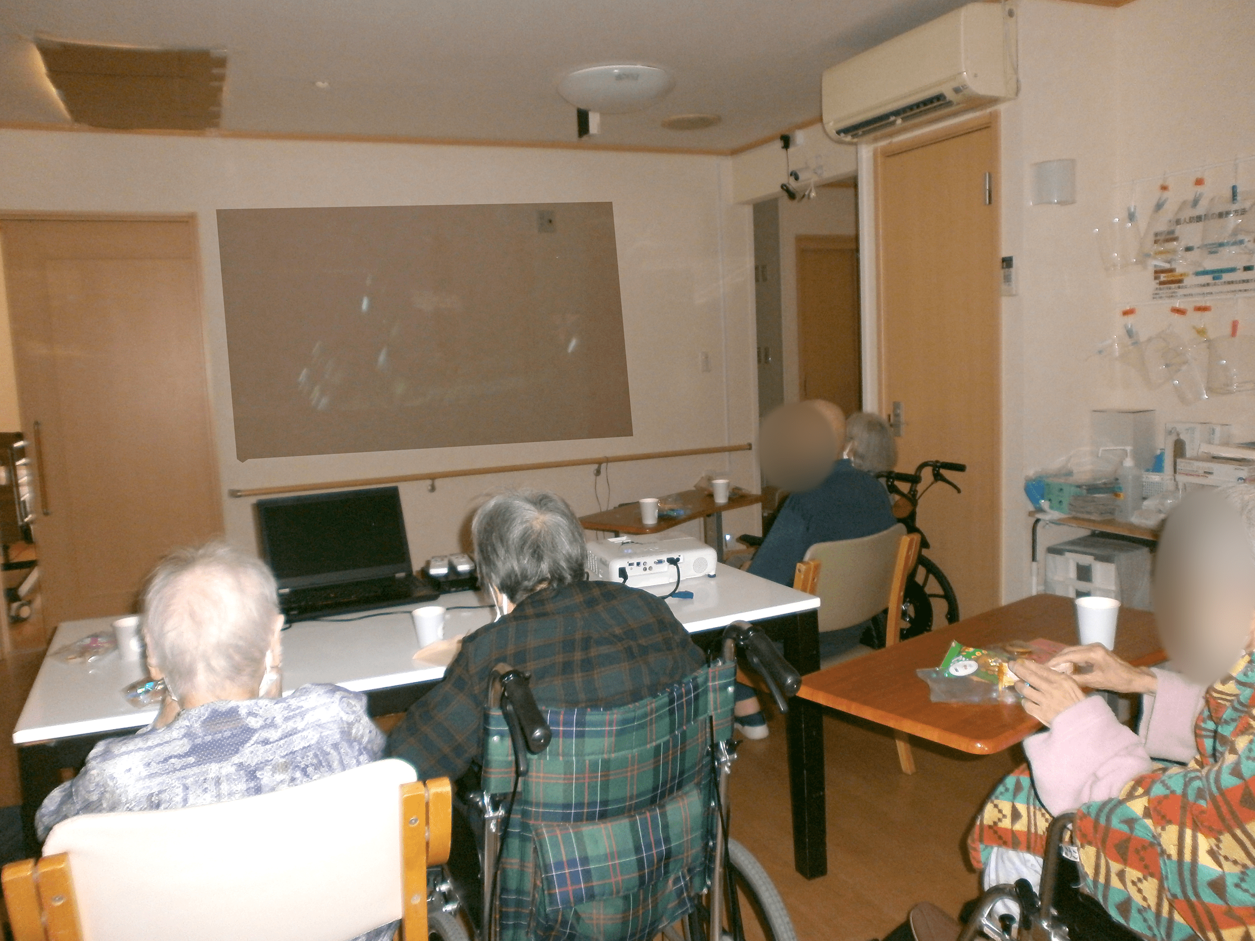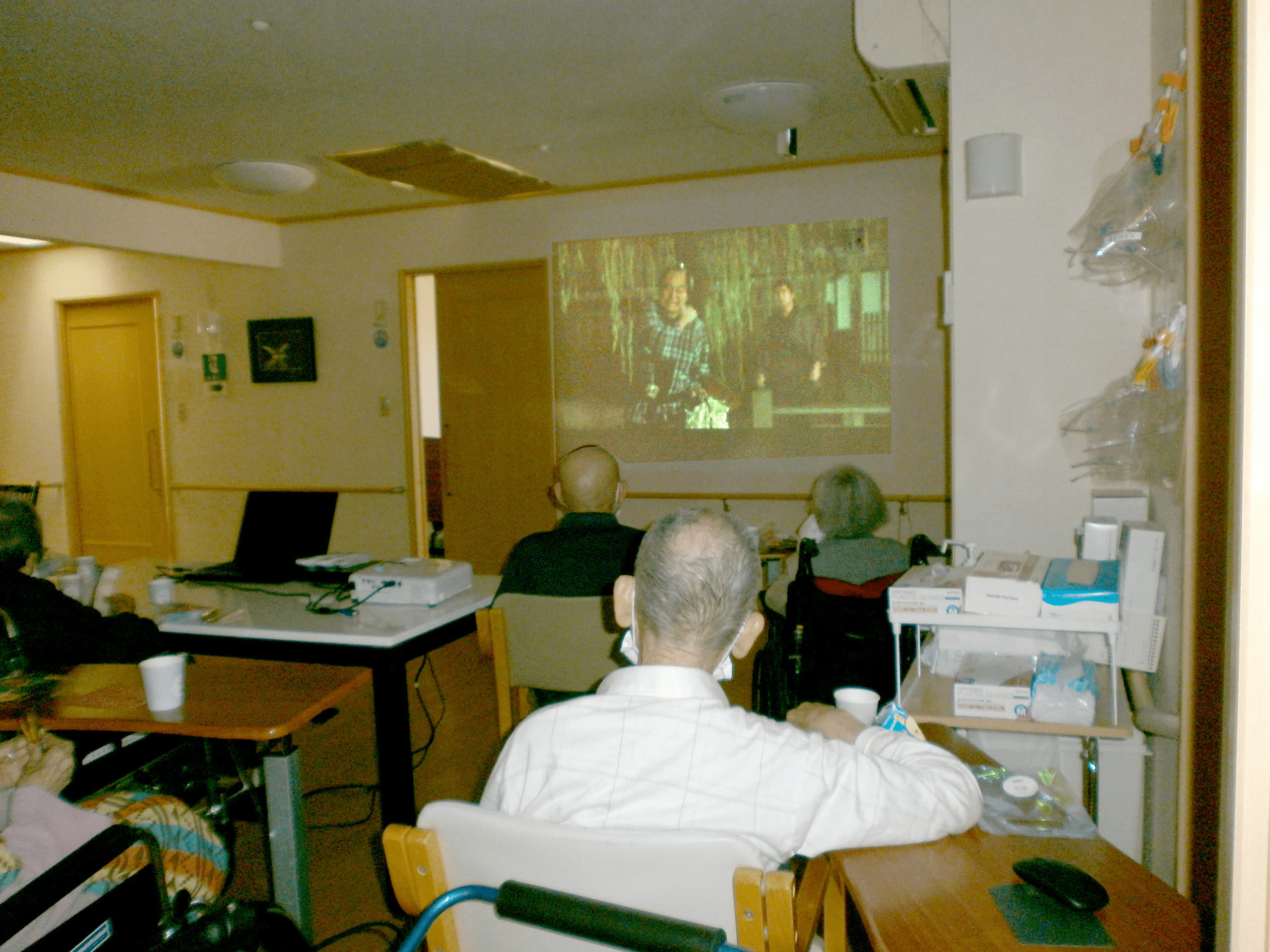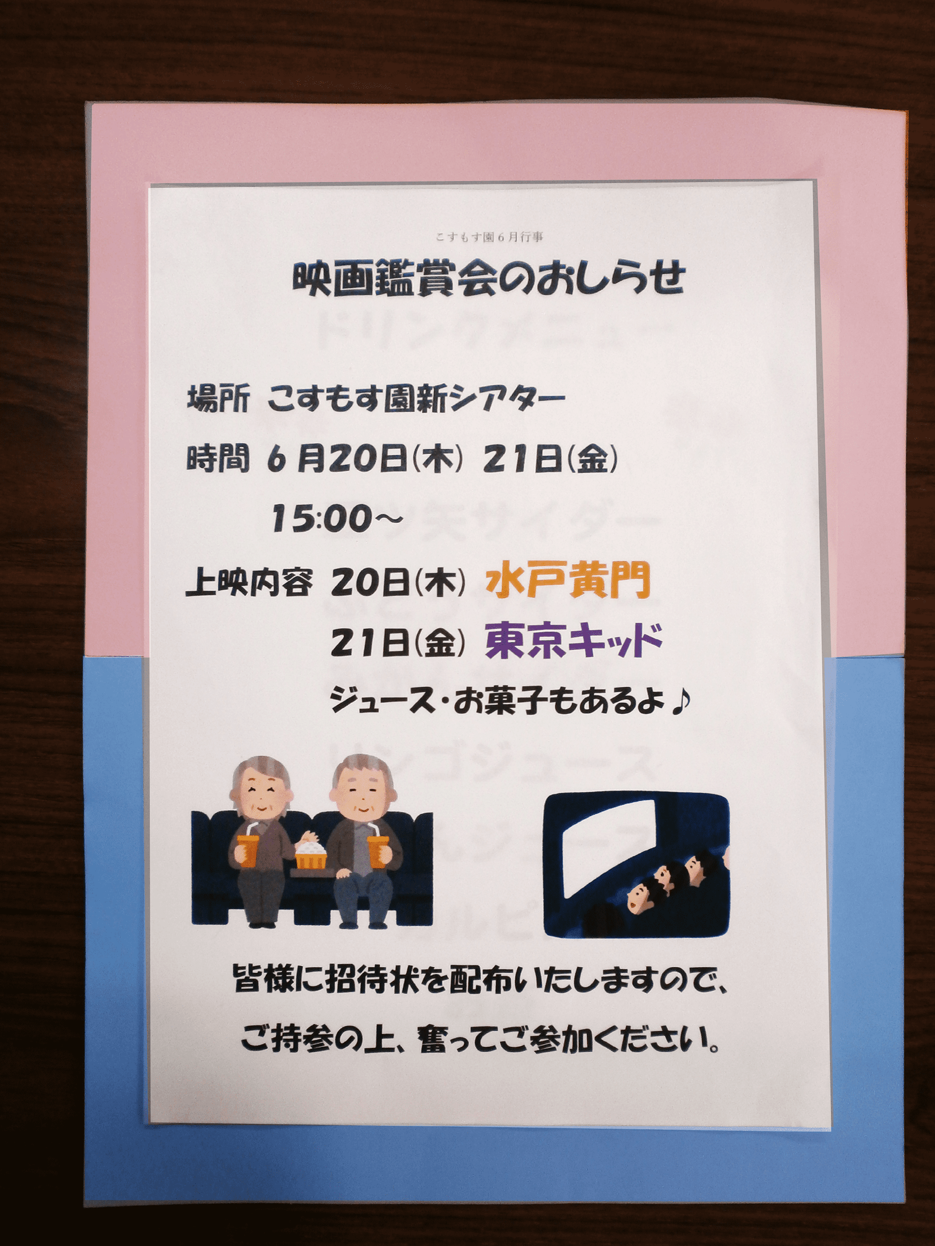 プロジェクターを利用して、こすもす園内に映画館を再現。皆さんに映画鑑賞で懐かしい気分に浸っていただこうと、スタッフが色々と準備を行いました。天窓の光を遮り、おやつとジュースを準備。ジュースはメニューから選んでいただけるようにしました。