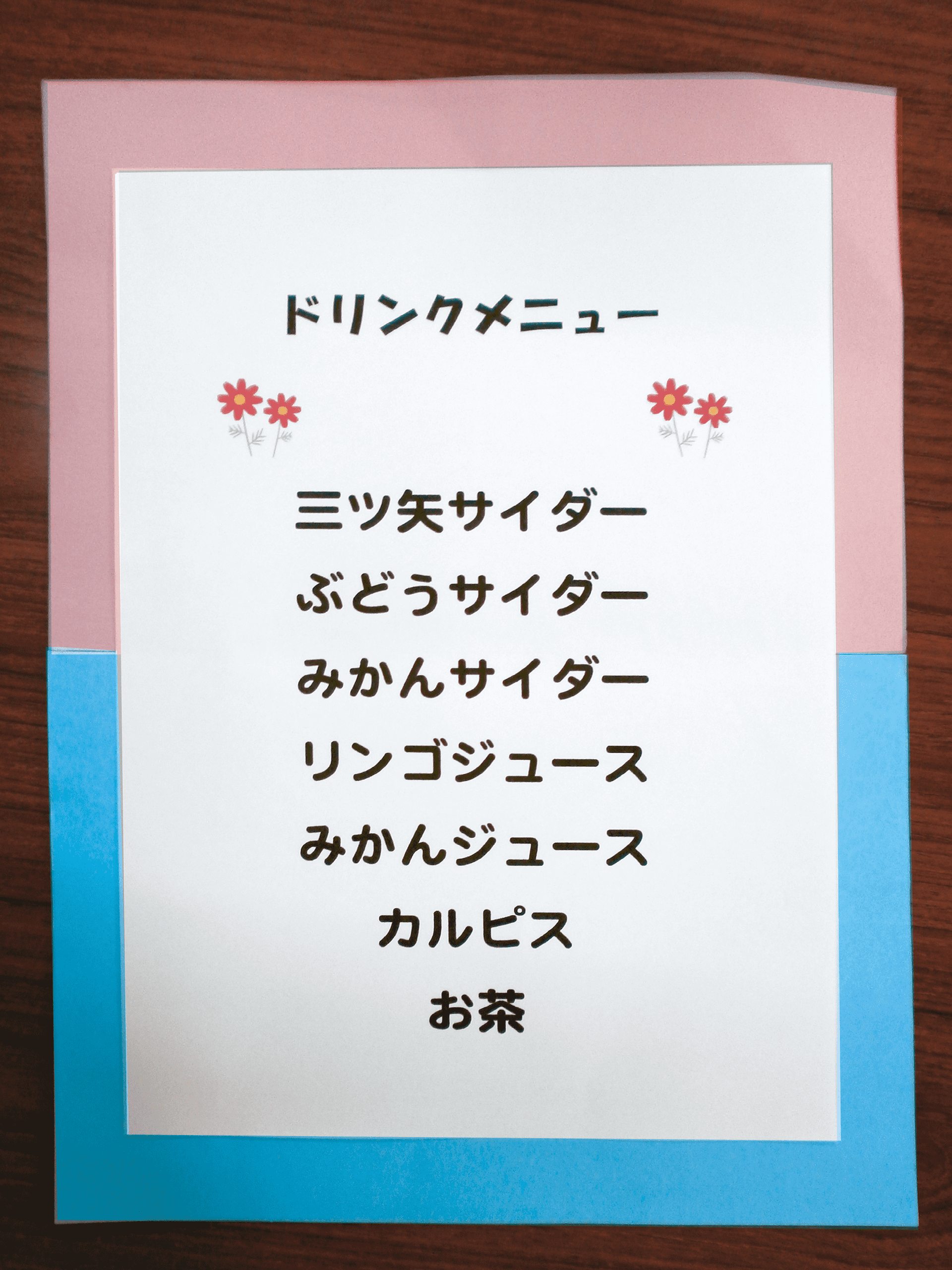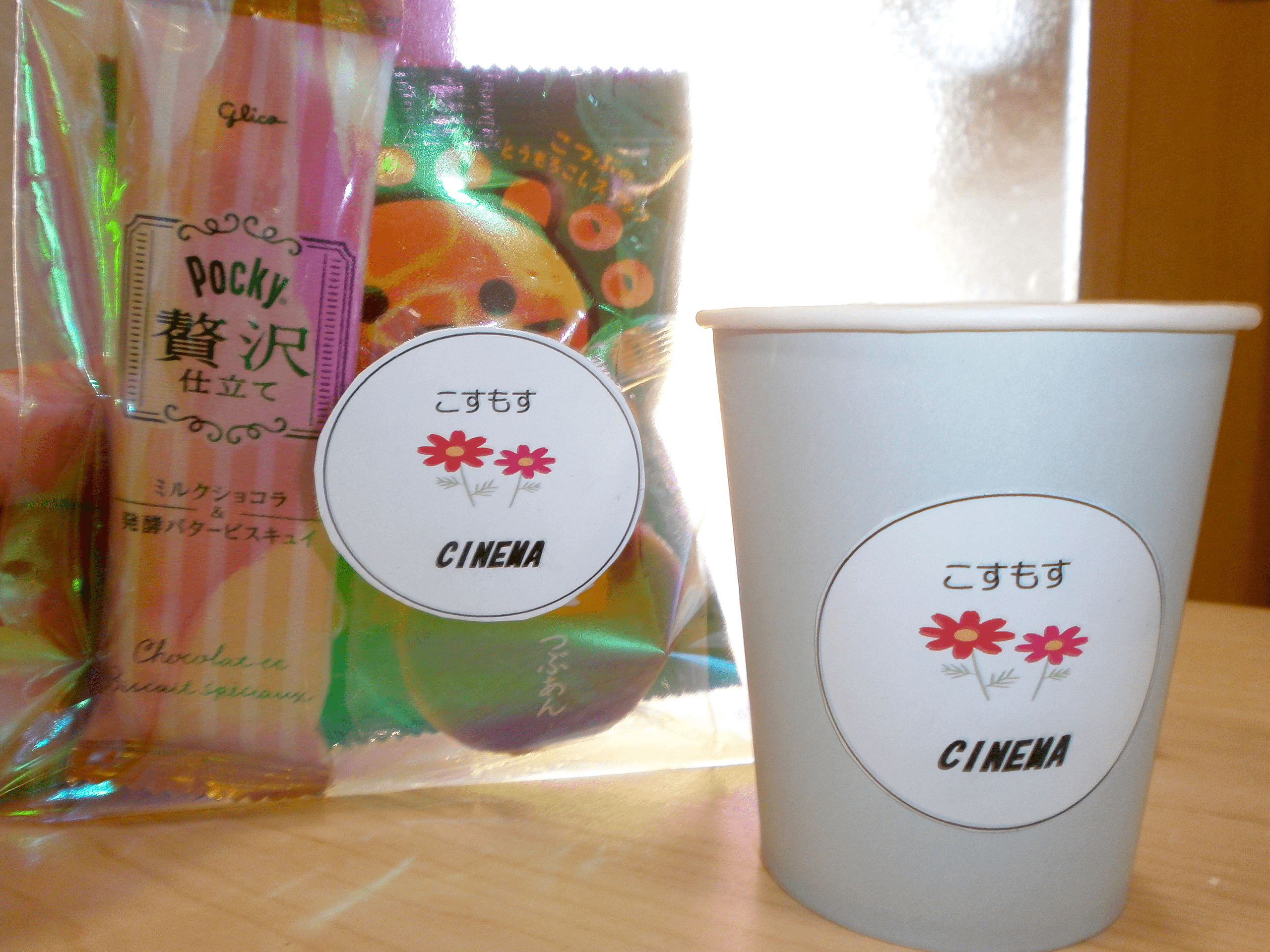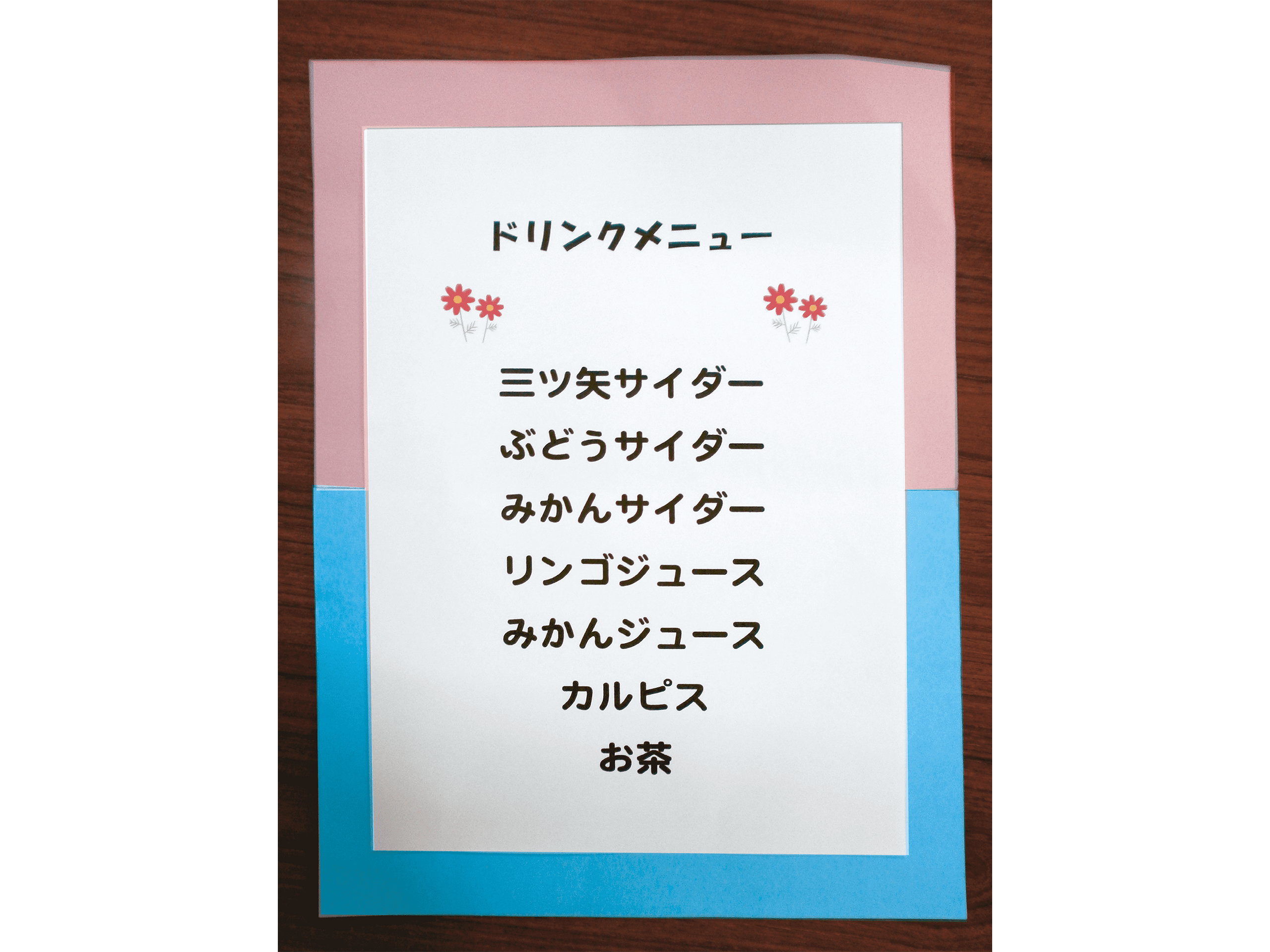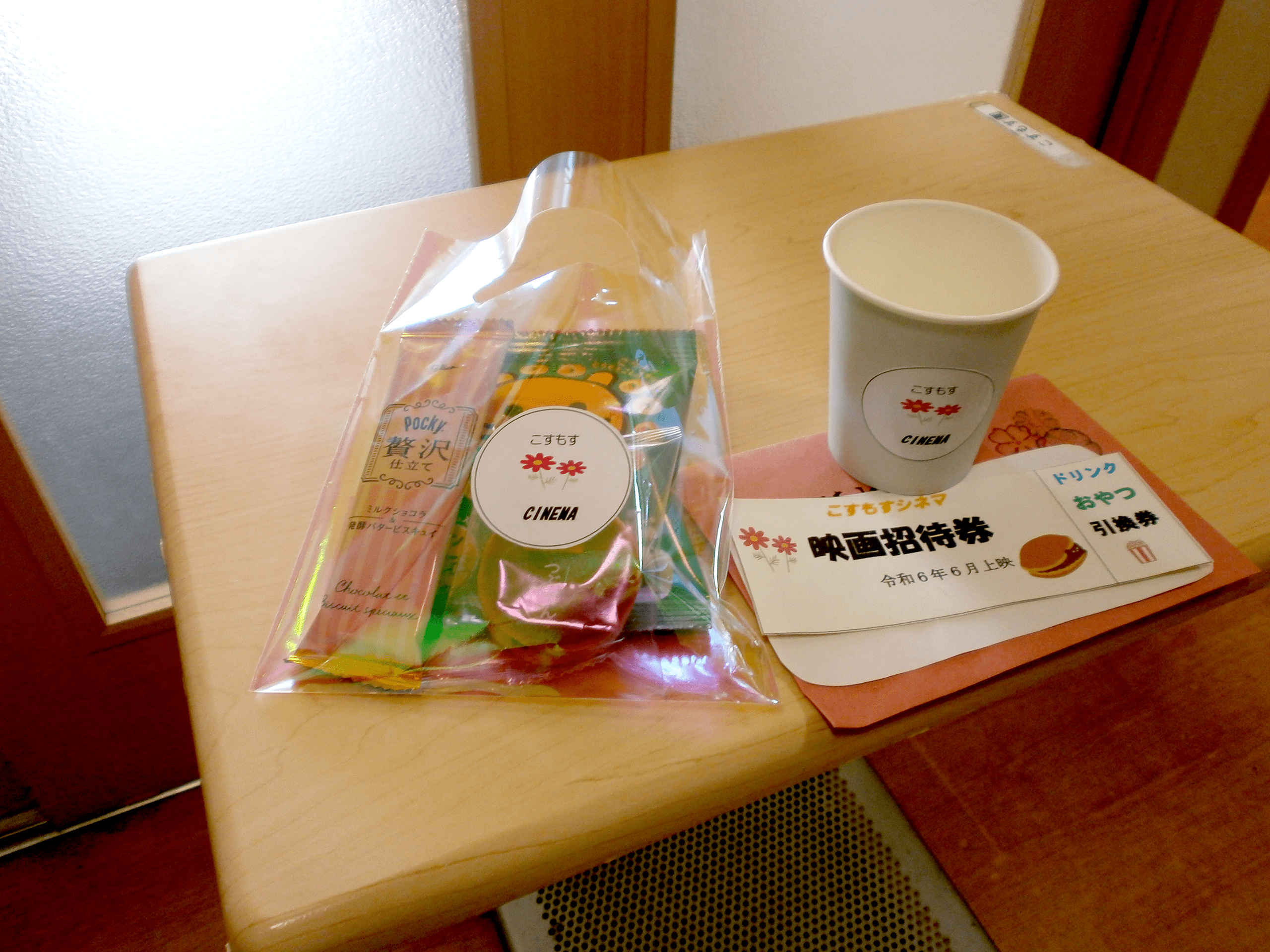 プロジェクターを利用して、こすもす園内に映画館を再現。皆さんに映画鑑賞で懐かしい気分に浸っていただこうと、スタッフが色々と準備を行いました。天窓の光を遮り、おやつとジュースを準備。ジュースはメニューから選んでいただけるようにしました。