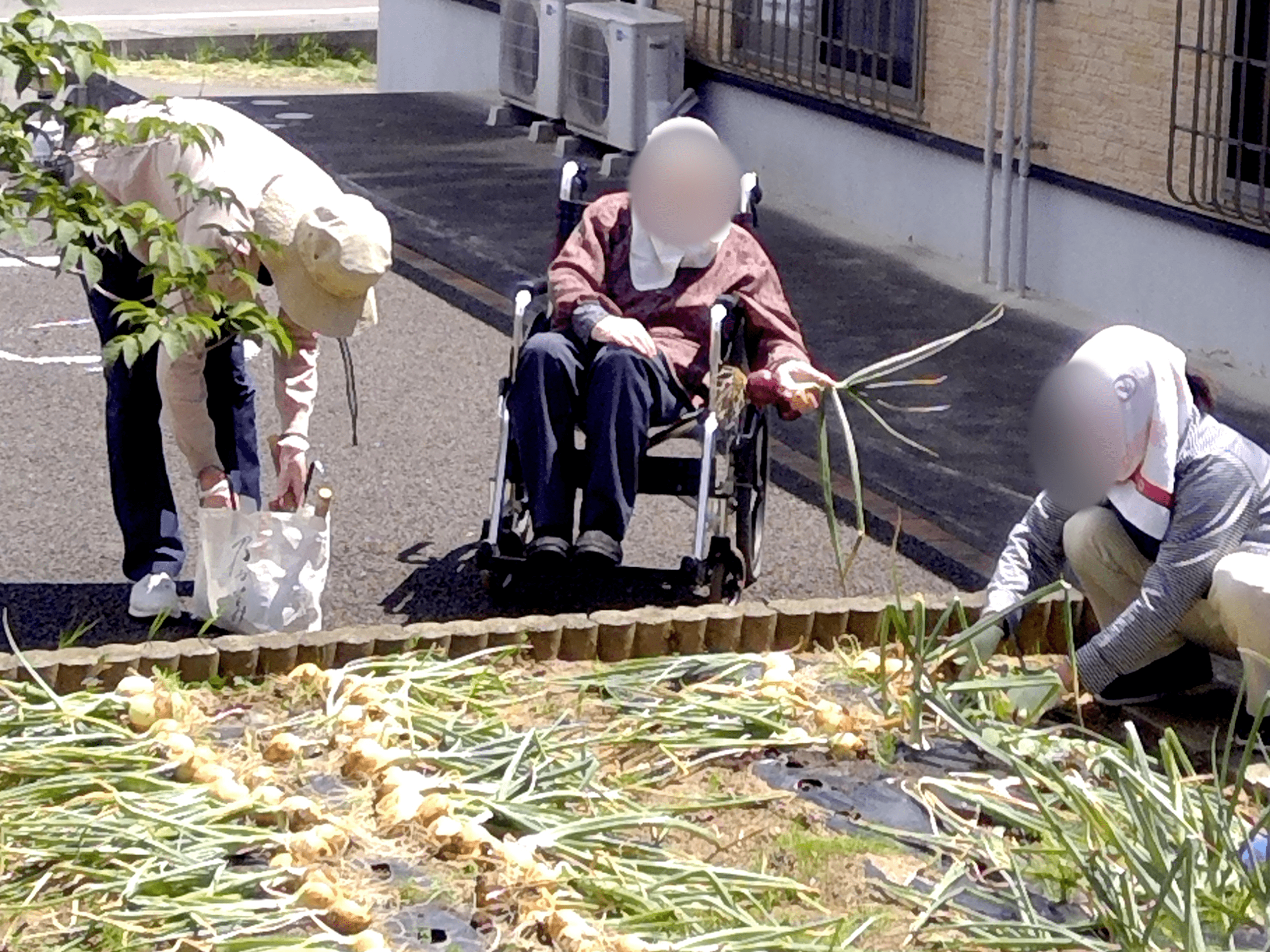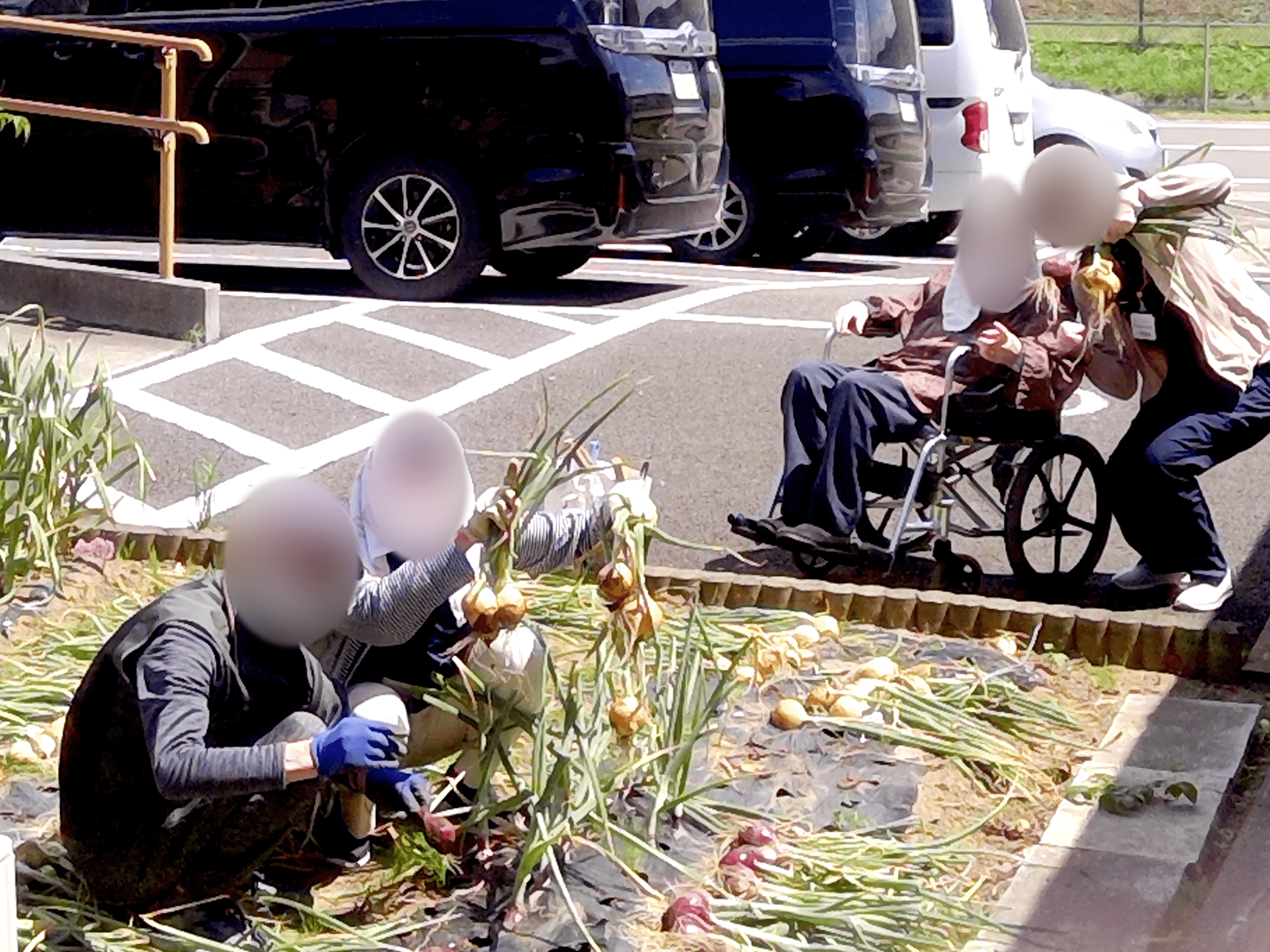 6月の晴れの日、見事に育った玉ねぎの収穫際が行われました。利用者様と一緒に大きく実った玉ねぎを収穫すると、見学していた利用者様やスタッフから大きな歓声が上がりました。