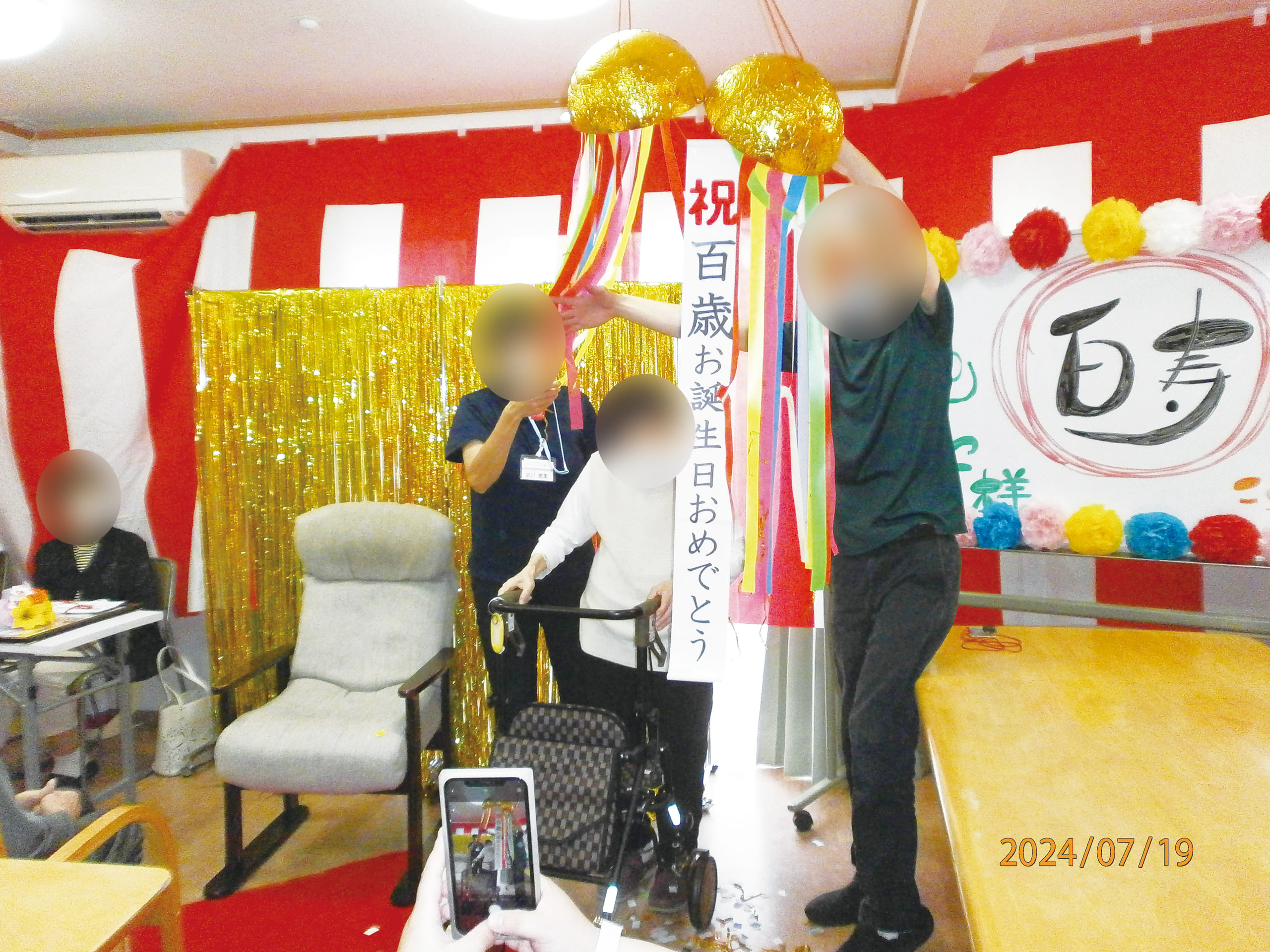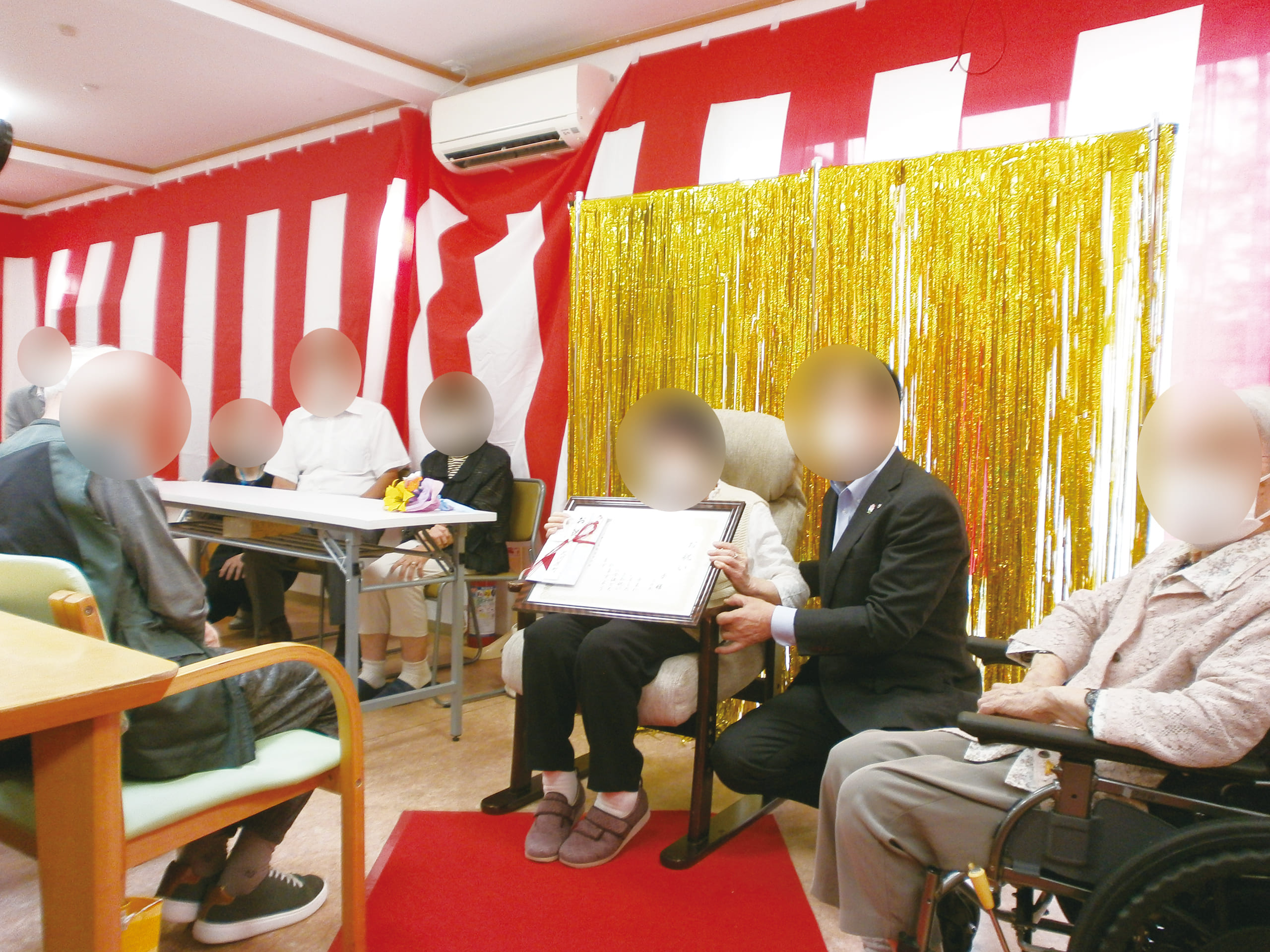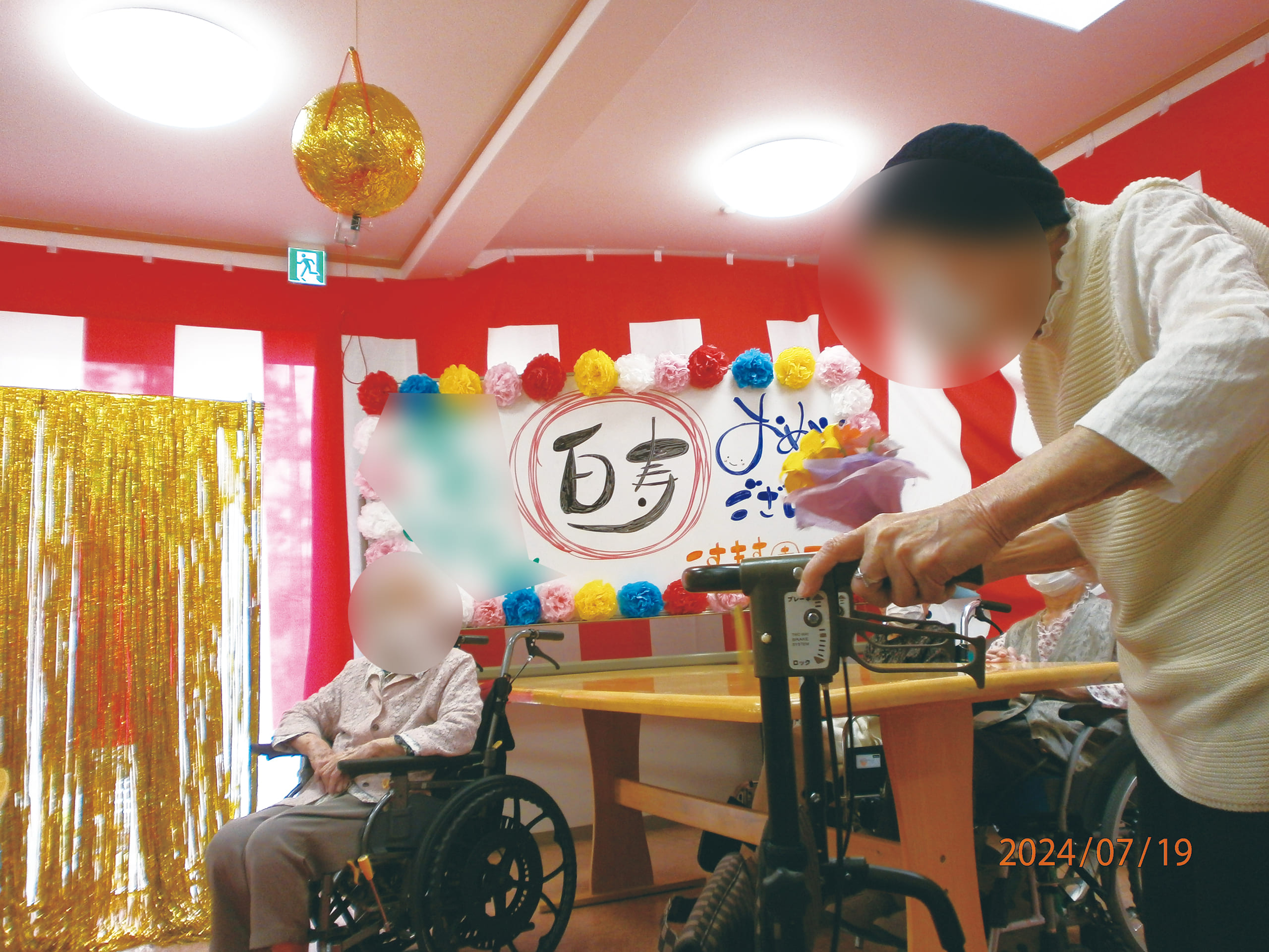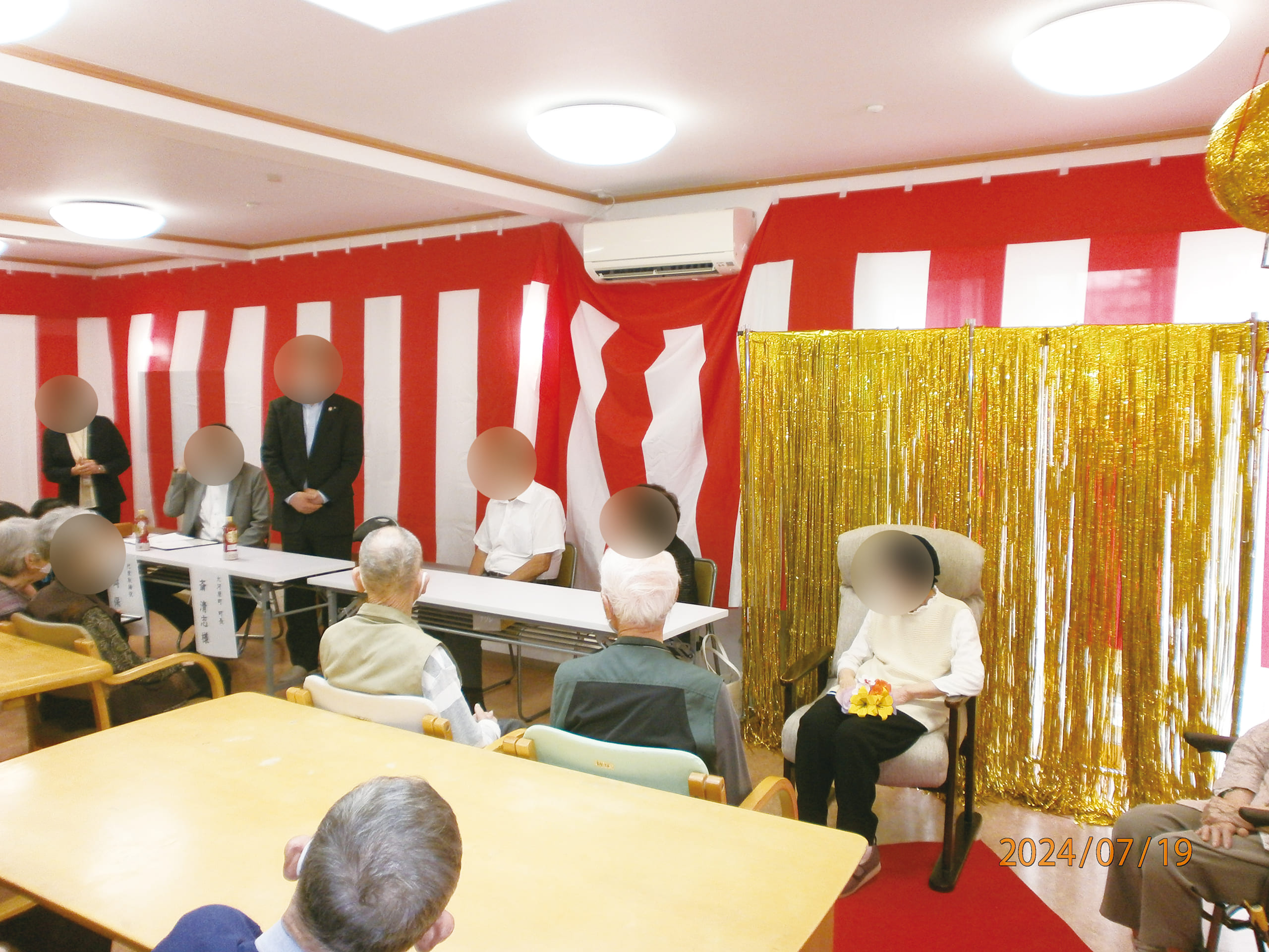 7月19日、こすもす園で100歳をお祝いする会が開催されました。当日は100歳を迎えたH様のご家族様、大河原町長もご臨席いただき、盛大な会となりました。