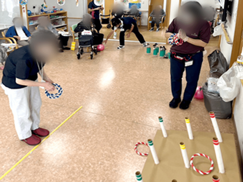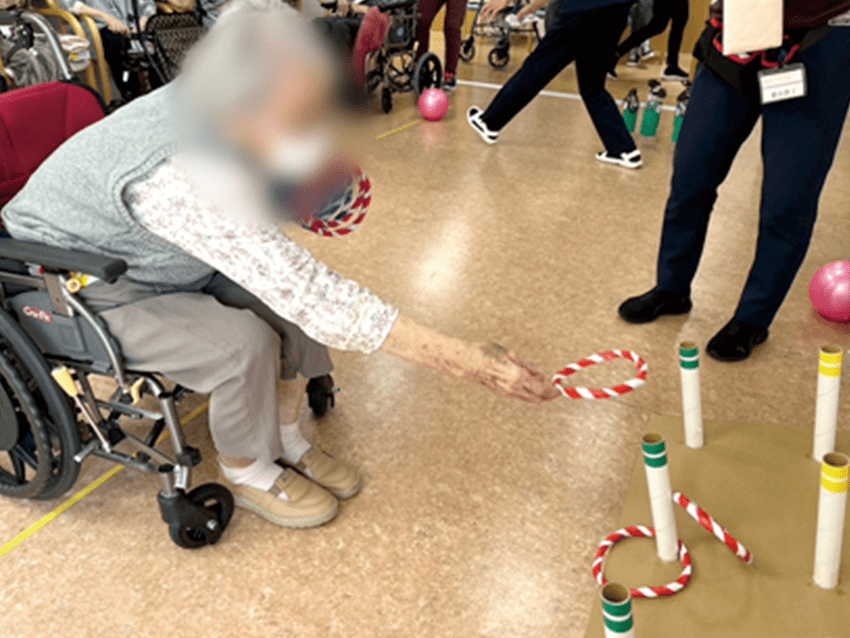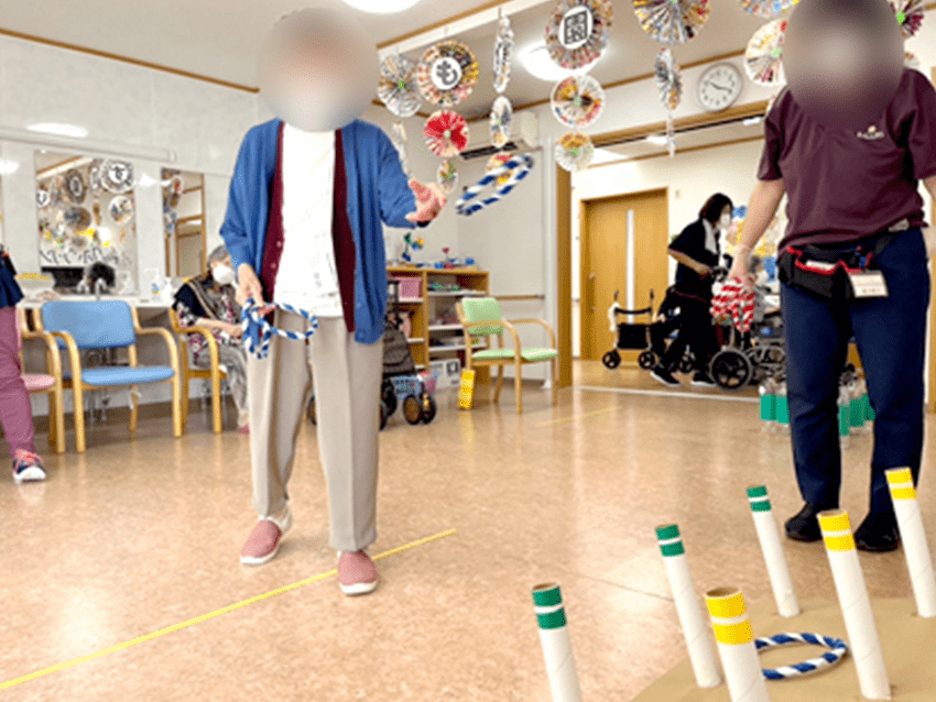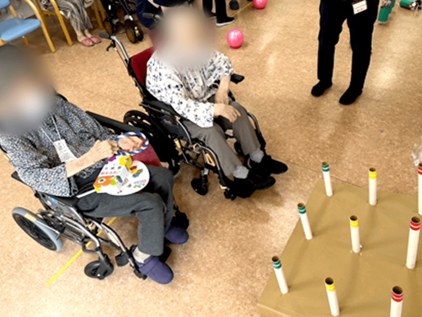 利用者様と一緒に作ったペーパーフラワーに、お手玉の重りを付け「枯れ木」に見立てた的に投げる!