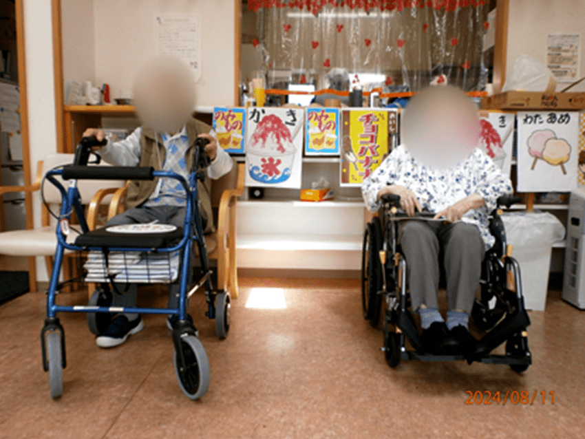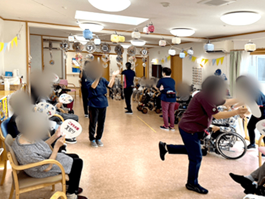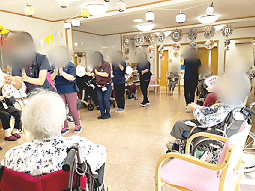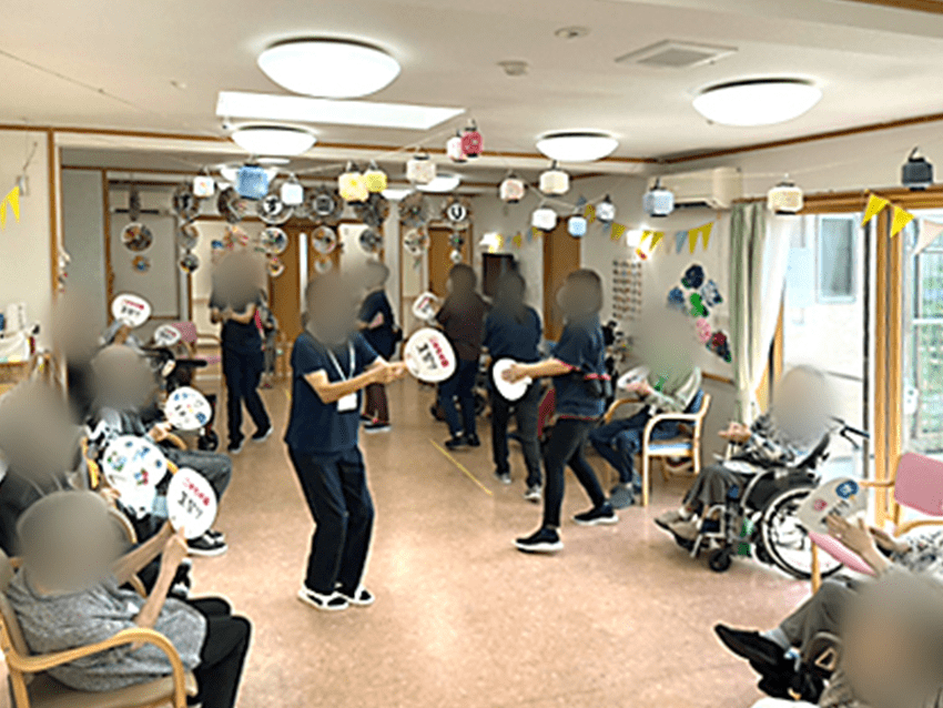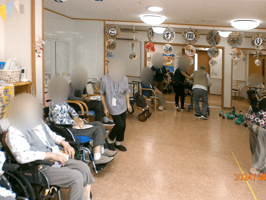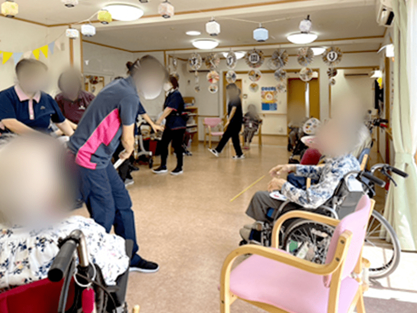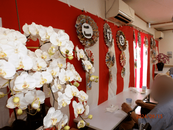 当日を迎えるまで、利用者の皆様と全職員でのうちわ作りや提灯等の制作等、会話も弾む楽しい準備期間でした。