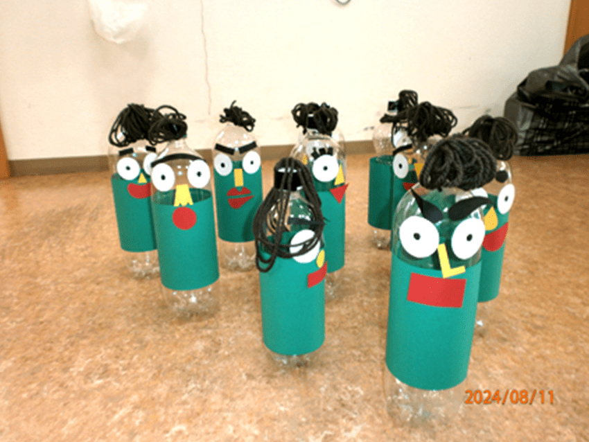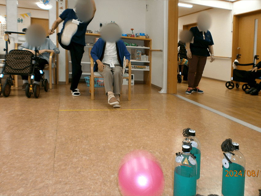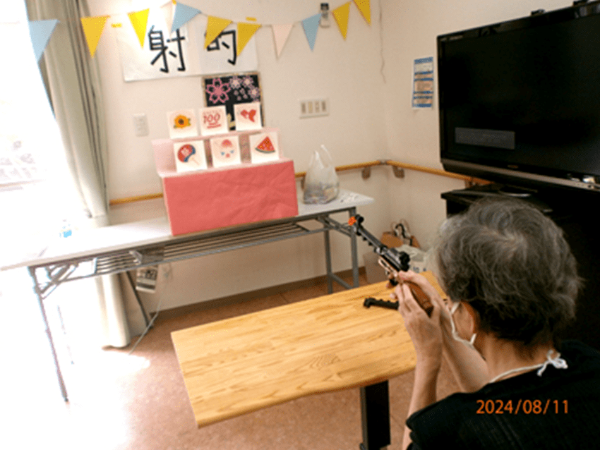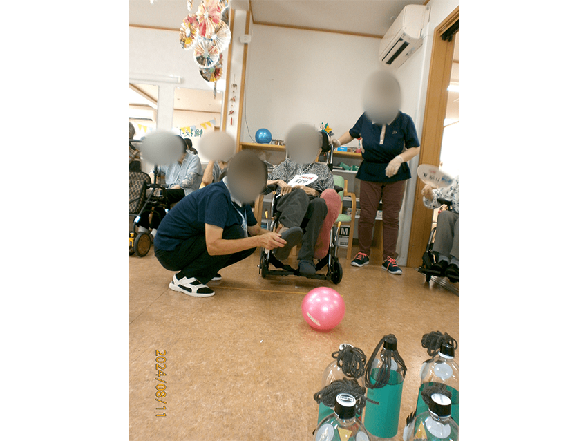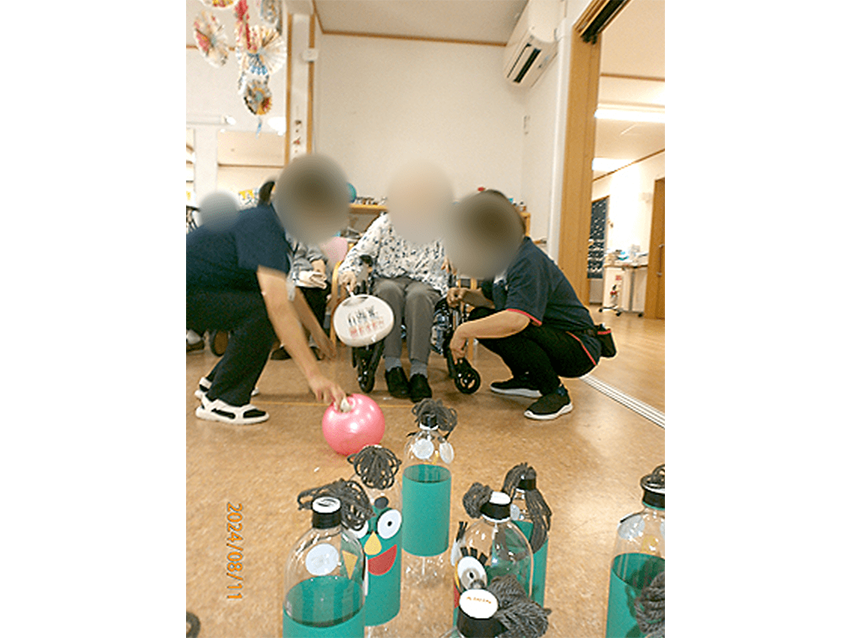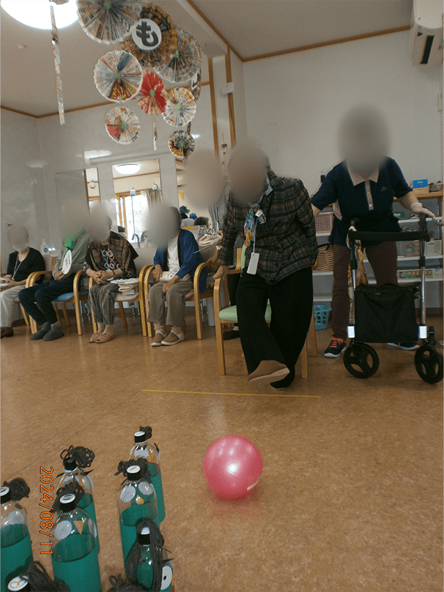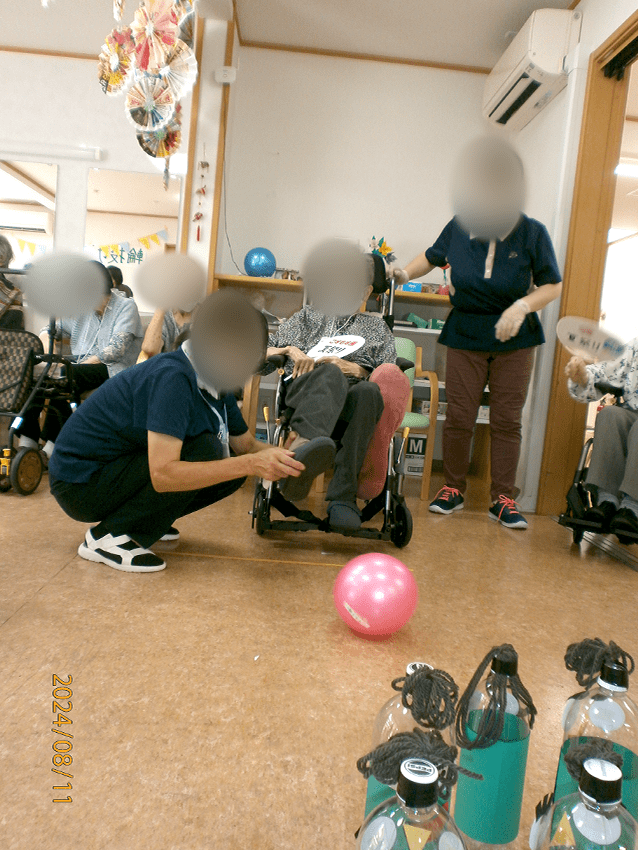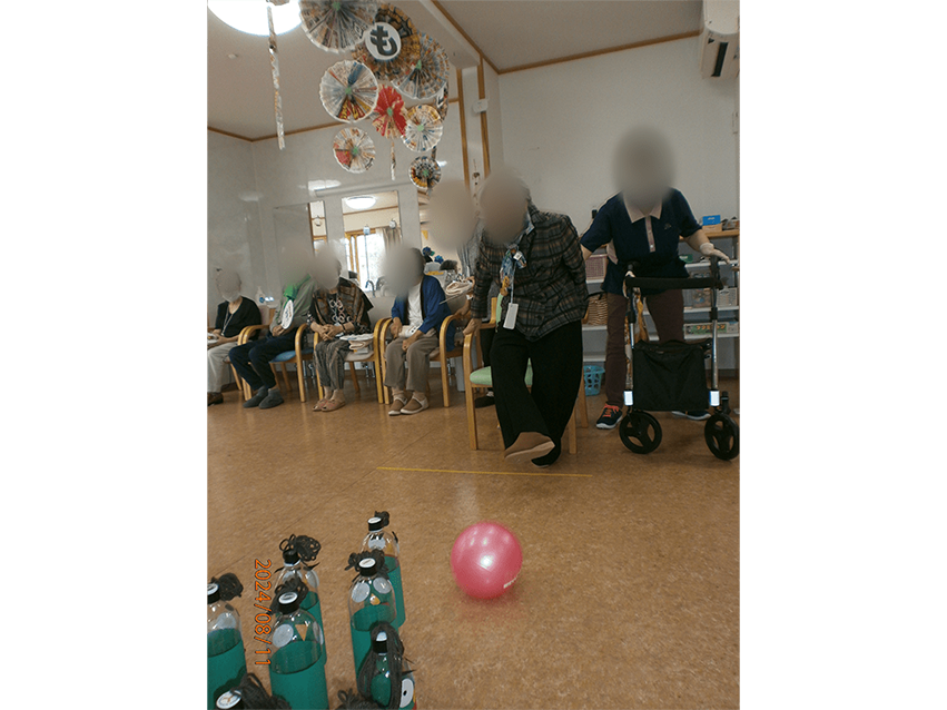 盆唄が流れ、一人ひとり引換券を首から下げてゲーム会場へ。ウキウキした表情で足を運ぶとそこでは…キックボウリング、射的、輪投げ、身体全体を使っての楽しいゲーム!しかも景品付き!笑い声の響き渡る楽しい時間でした。