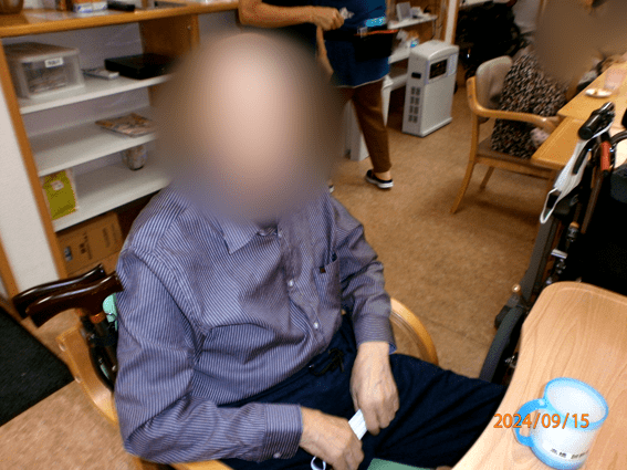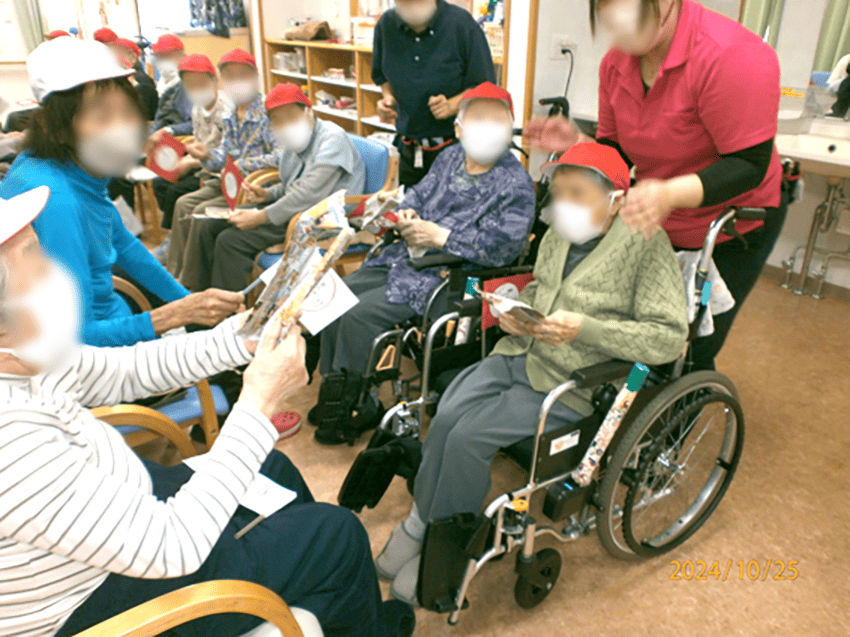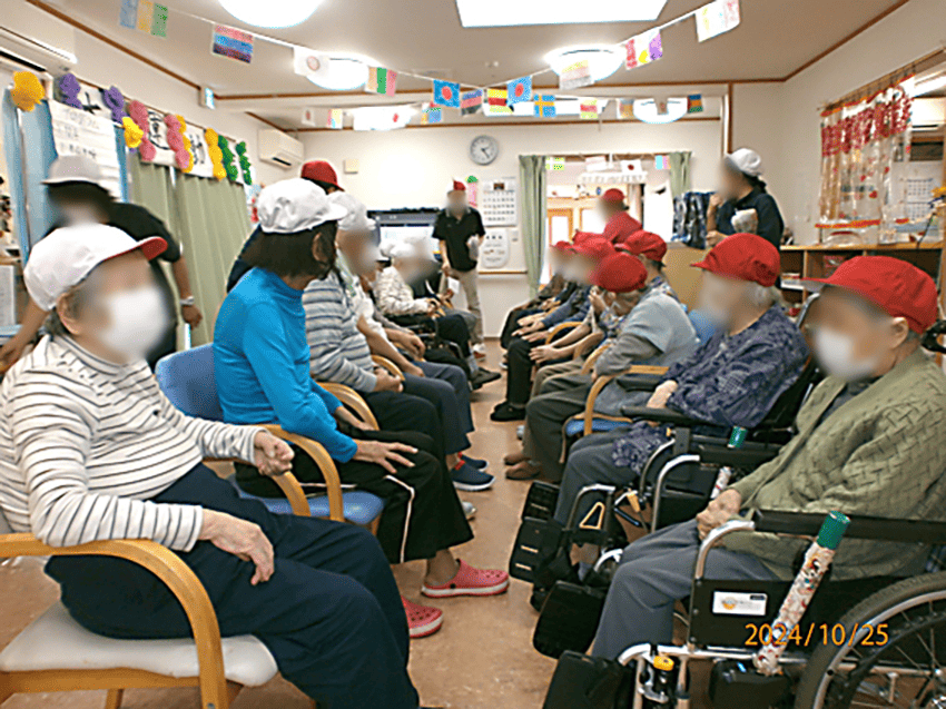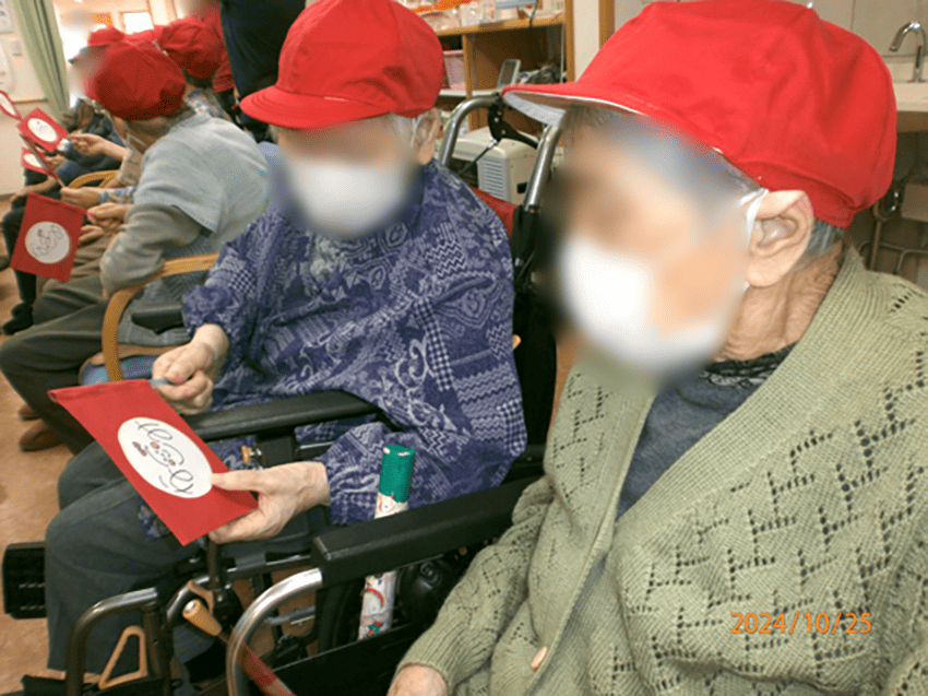 当日は太鼓の演奏が予定されており、迫力のある演奏を利用者様も職員も楽しみにしていました。ところが、太鼓演奏者のご都合により演奏中止となってしまいました……が、敬老お祝い会でリビングに集まると、利用者S様より「太鼓が聞けなくても、こうして皆でお祝い出来て楽しいね」と一言。その言葉で園内に拍手が響き渡りました。その光景に職員も胸がいっぱいに……(涙)。
