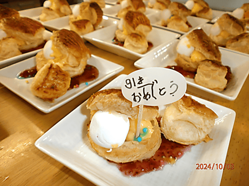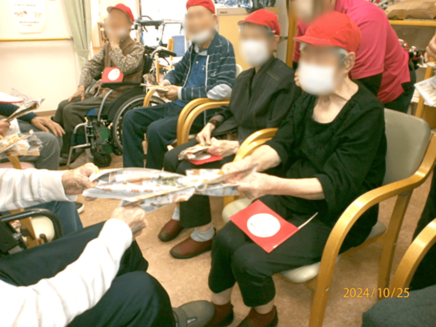 その後、厨房スタッフが腕を奮った華やかでおいしいお膳とお饅頭でお祝いしました。皆様の温かく穏やかなお心に感謝です。今年も敬老会を迎えられたこと、心よりお祝い申し上げます。健やかに年を重ねられるお姿は私たちのお手本です。これからも明るく元気に過ごせますようお祈りいたします。