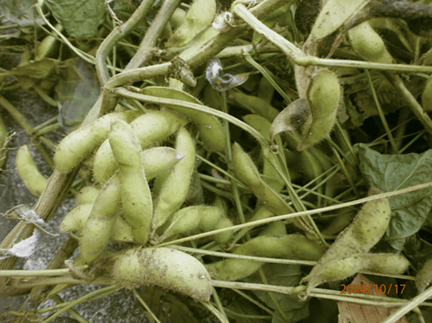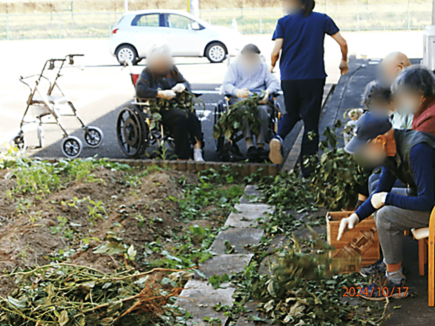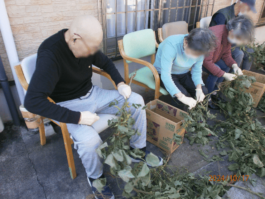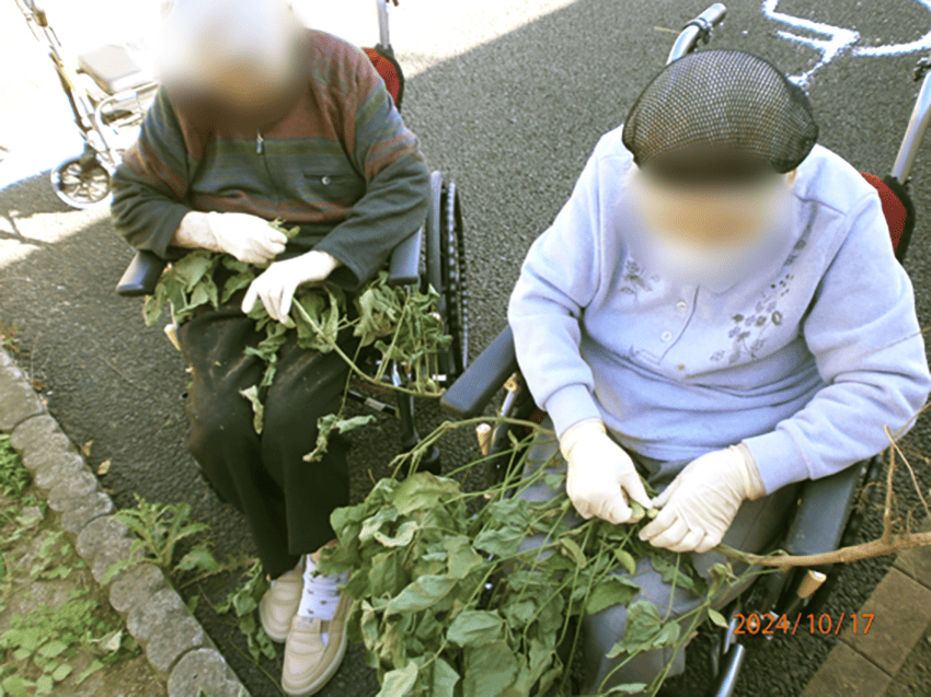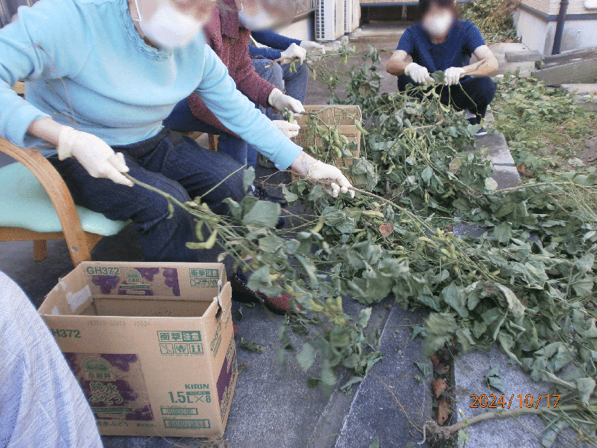10月17日、10月とは思えない温かな明るい日になりました。こすもす農園最後のお野菜、枝豆の収穫にはもってこい!! 利用者様にお手伝いいただき、大収穫祭となりました。