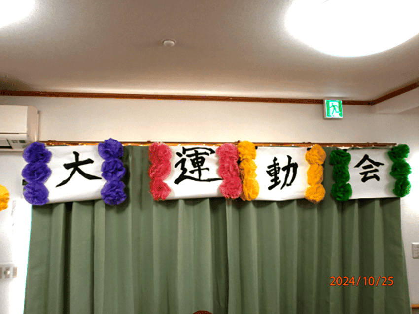 当日を迎えるまで、万国旗作成や花作りなどたくさんの利用者様にお手伝いいただきました。特に「大運動会」の看板は書道の得意なT様にお願いしたところ、快く引き受けていただき あっという間に仕上げてくださいました!