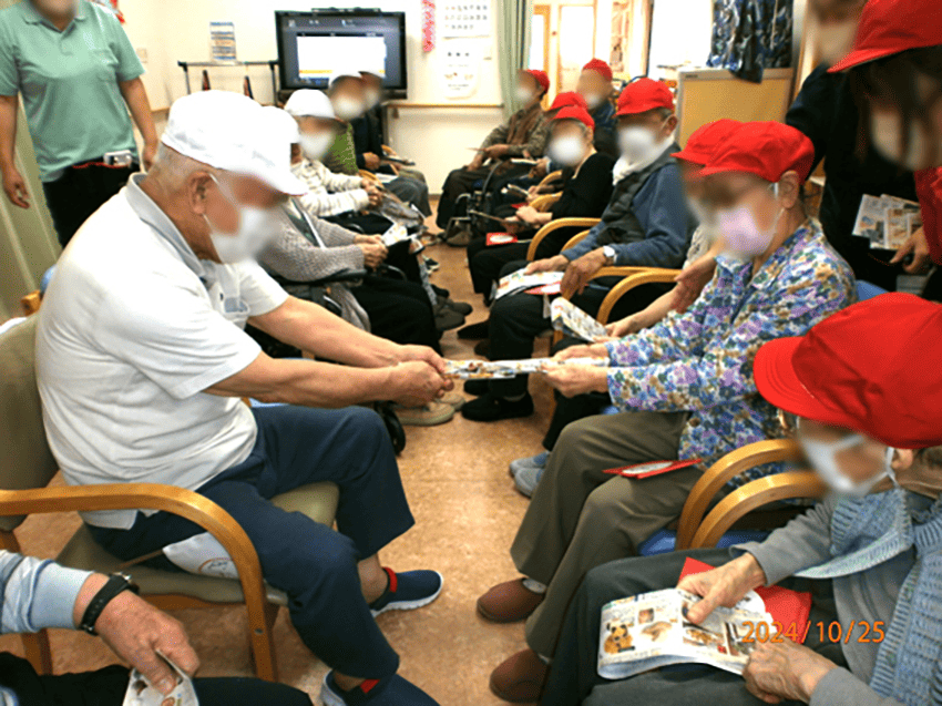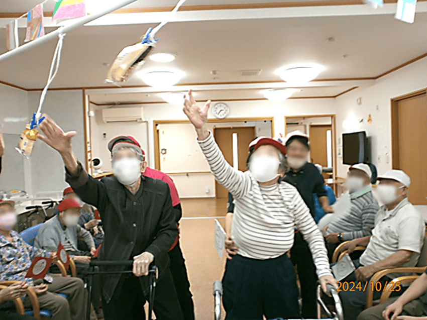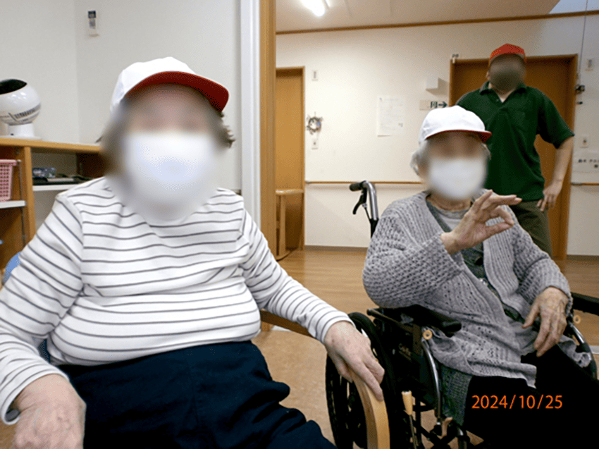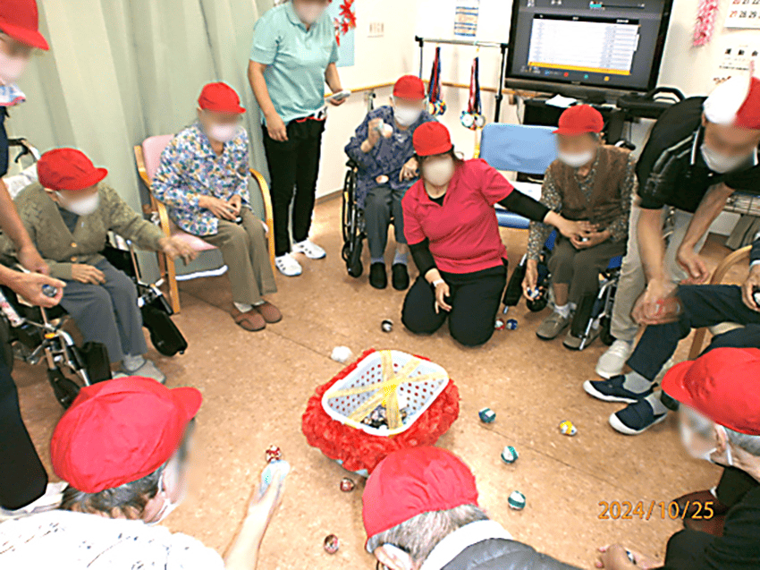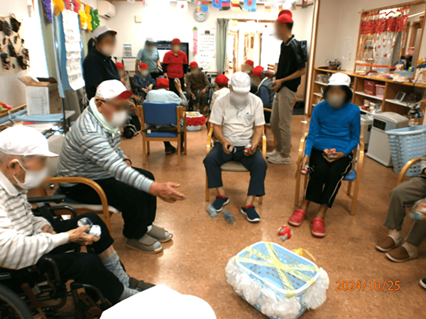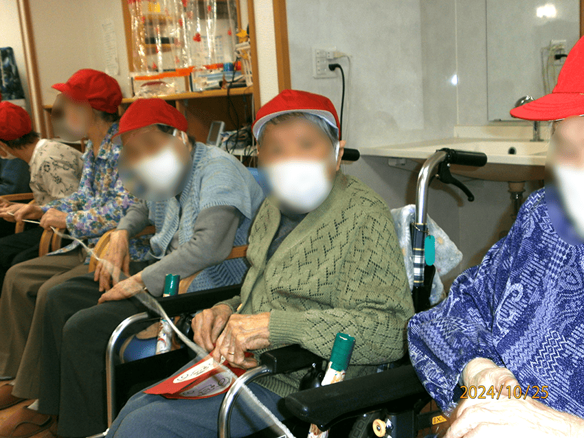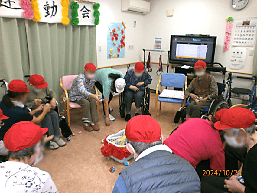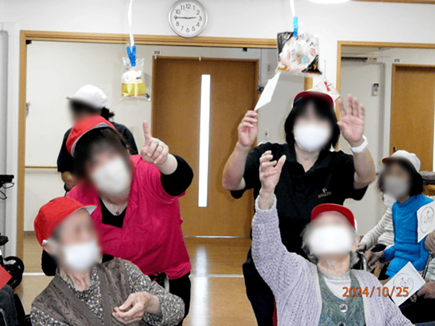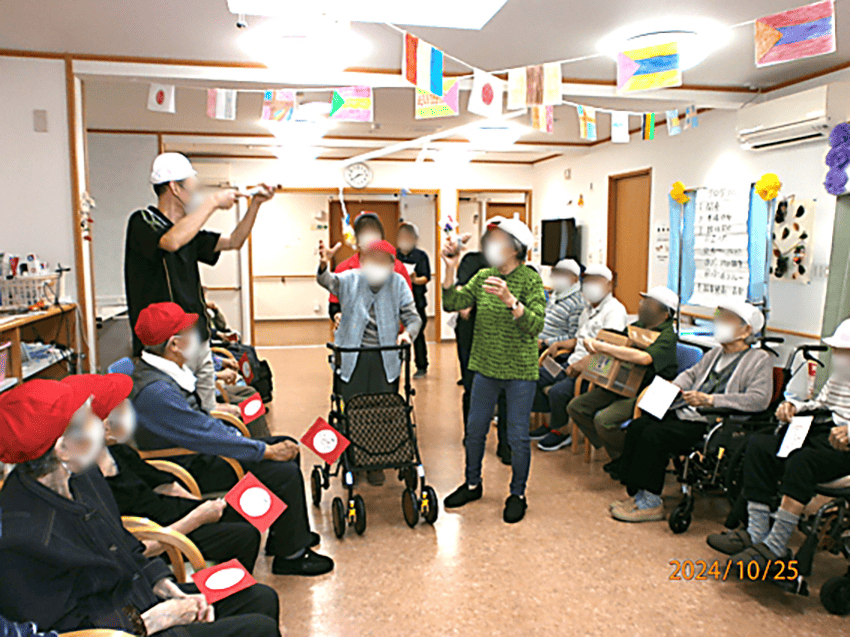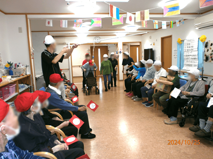 今回はなごみ館にお住まいの方が紅組、むつみ館にお住まいの方を白組としての紅白戦。気合いの紅白帽をかぶりいざ決戦!