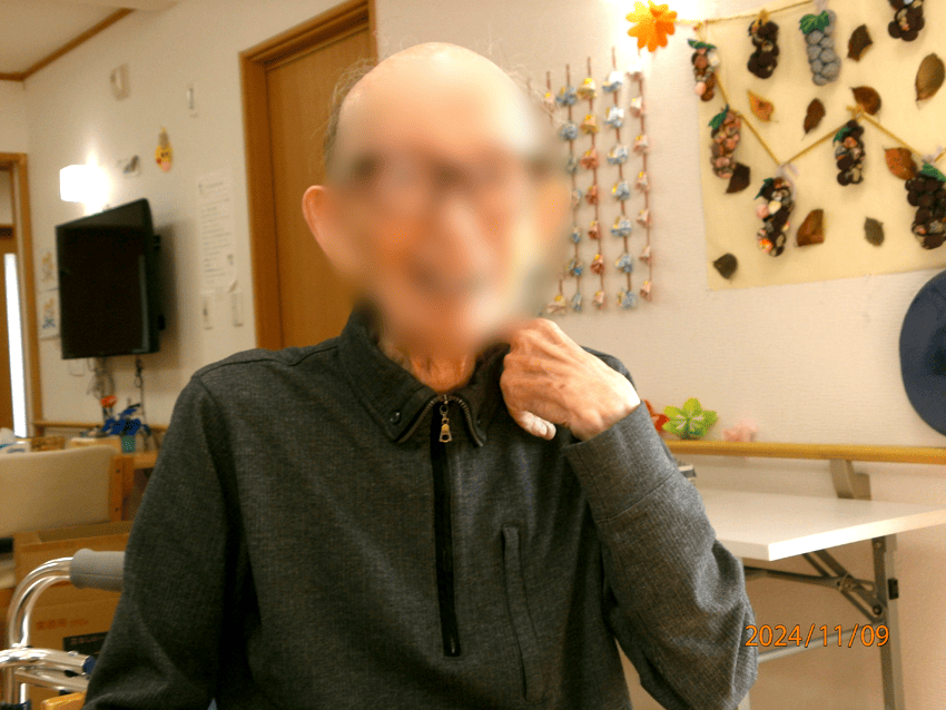 90歳を迎えるT様は職員に囲まれプレゼントを受け取り、「何歳になりましたか~?」や「プレゼントどうですか~?」の声がけに、見たこともないような満面の笑みでGoodのハンドサイン!私たちもうれしい気持ちいっぱいになりました。