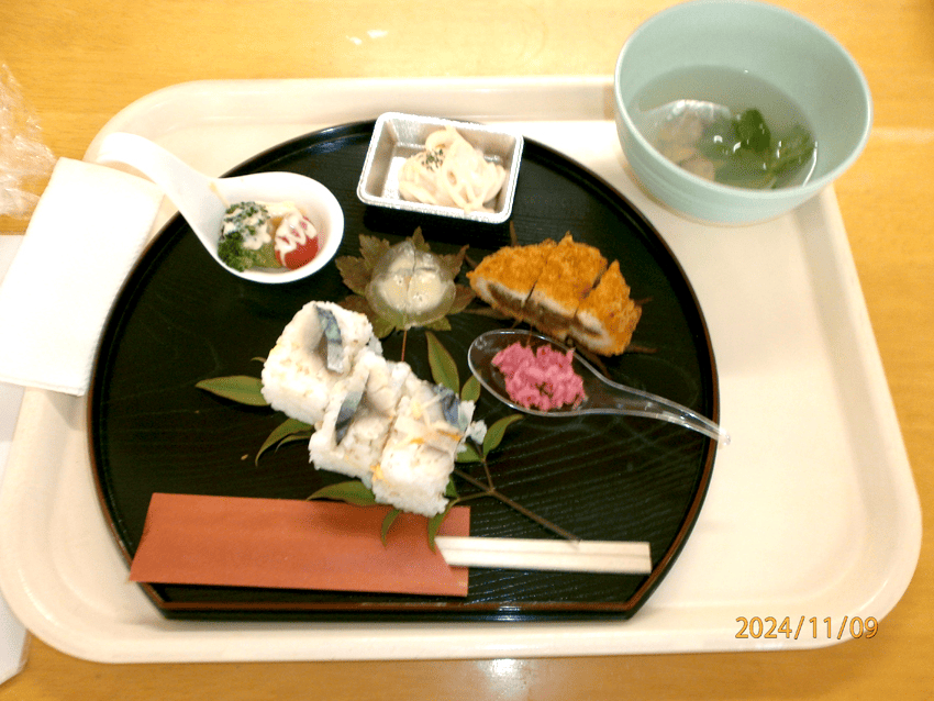 お彼岸という事もあり厨房スタッフも気合が入ります。今日のメニューはおはぎ三種(クルミ、あんこ、きな粉)、ほうれん草のジュレかけ、煮物、魚の餡掛け、卵と新玉ねぎのオーロラソース掛け、赤カブの酢の物、サンマのつみれ汁、抹茶ゼリーと、豪華なお弁当です。