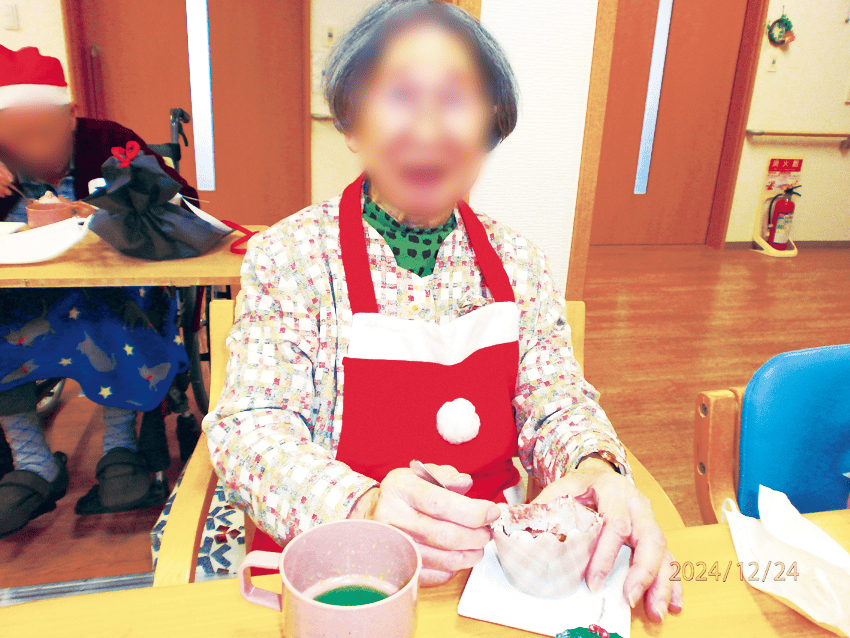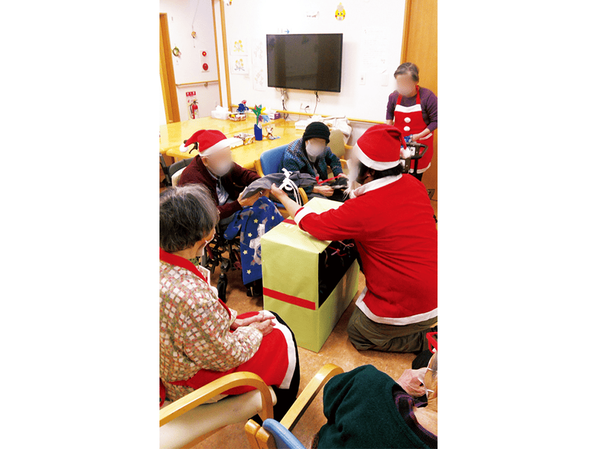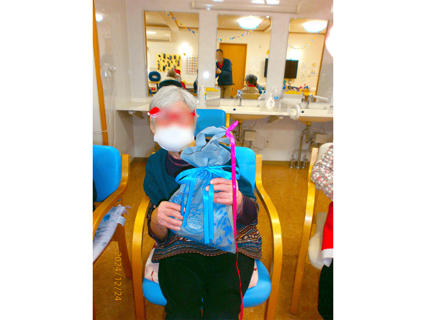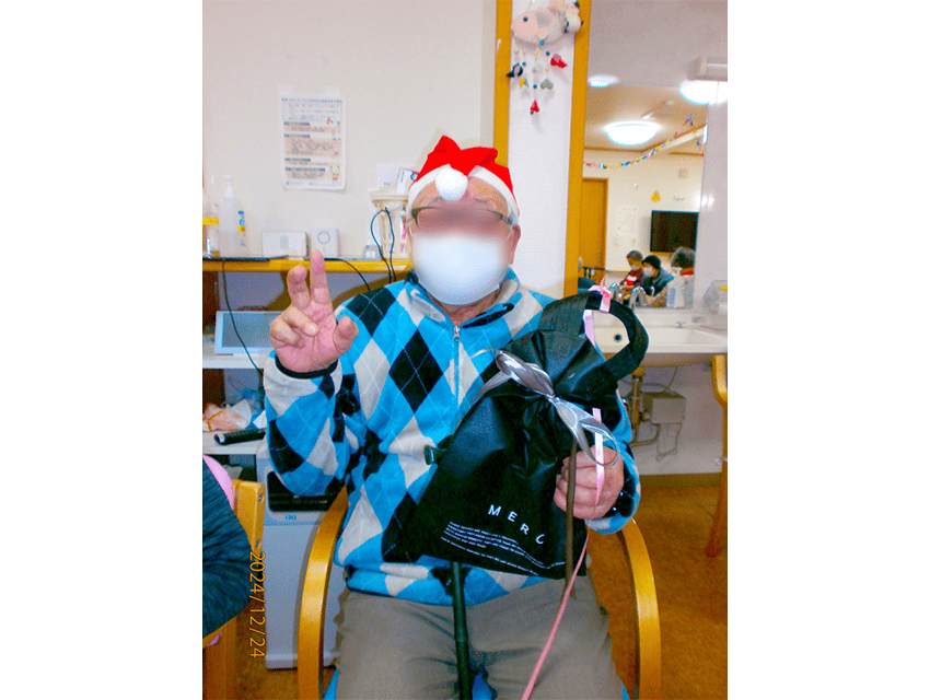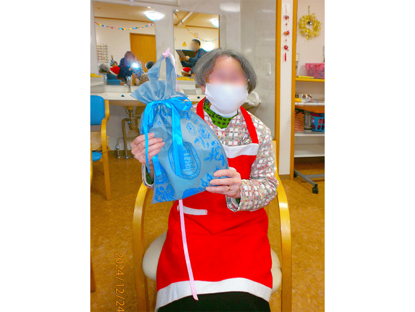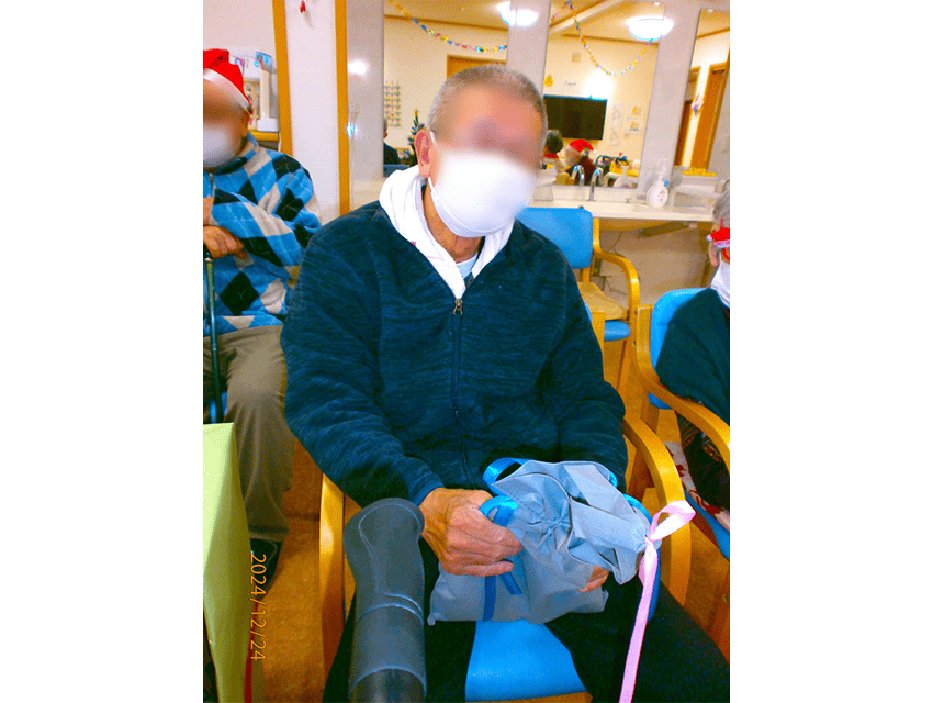 今回のメインはクリスマスプレゼントの紐くじ引き。プレゼントが括り付けられている紐を順番に引いてもらい、引いたプレゼントがもらえるというもの。プレゼントの入っている箱も職員手作り。「楽しいプレゼント選びだね~」と言っていただけました。立派な体(?)を思う存分発揮した職員のサンタも「似合うね~」と大絶賛。他にも「ツリーも飾りもとても綺麗!」「ケーキもかわいくて食べるのもったいない」「とても楽しいクリスマスだった」等のうれしいコメントをいただきました。