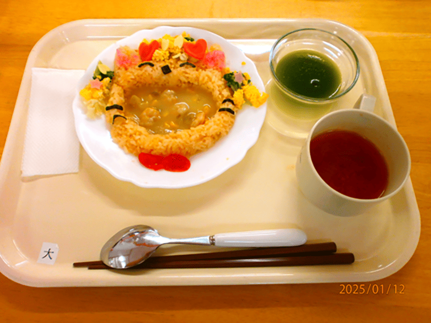 厨房スタッフはイヌをかたどったチキンライスにシチューを注いだとてもかわいいランチプレートを準備。今回も『食べるのがもったいない』という声が上がりました。