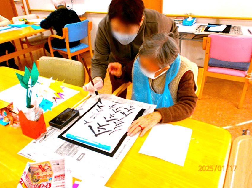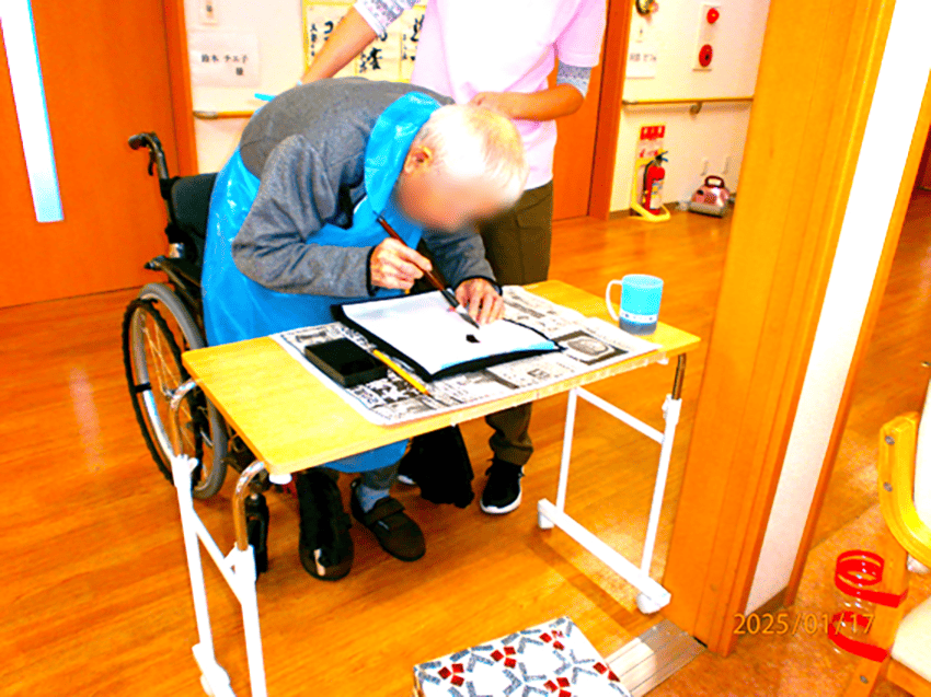 普段、車椅子で生活をされている物静かなK様のテーブルにも 書き初めの準備をしていると…