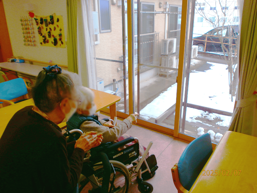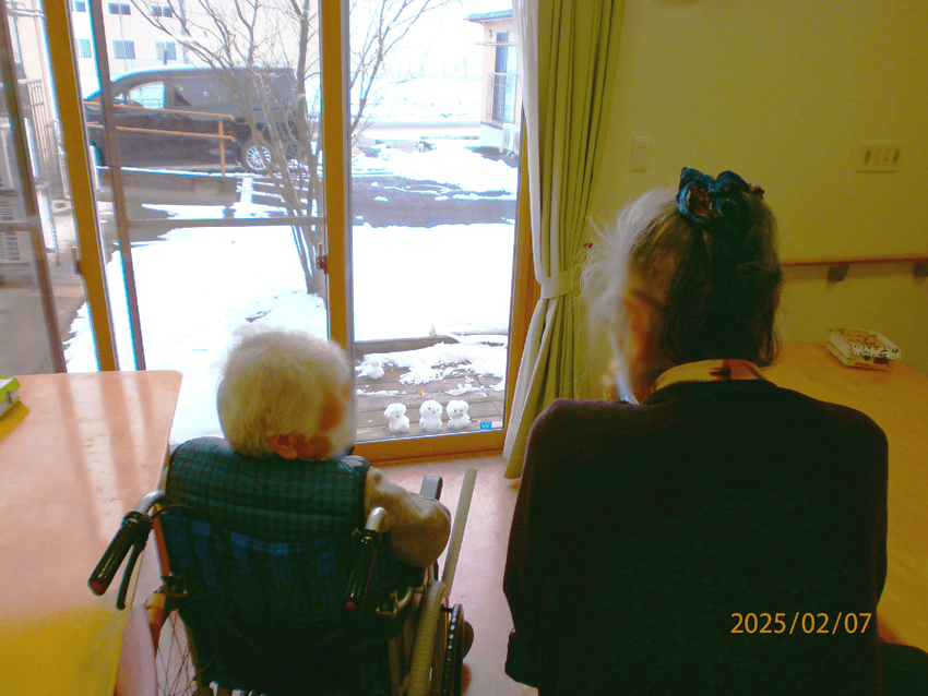 『今年は雪が少ないのかなぁ』なんて考えていたところ、2月の初めに雪が降りました。職員にとっては雪掻きや雪掻きや雪掻きや……。朝早くから除雪しなくちゃと思うところですが、入居者様方は『降ったわねぇ』『雪掻きしなきゃ』『きれいな景色ねぇ』等様々な反応が見られます。