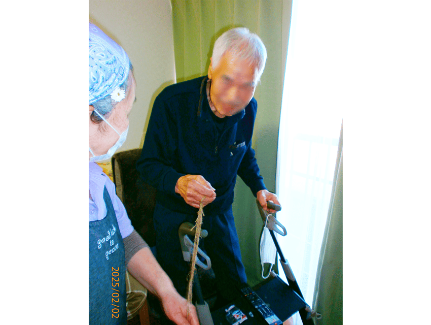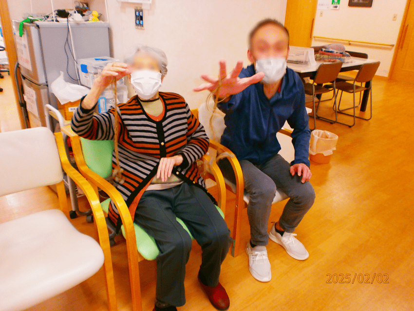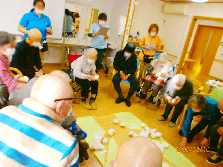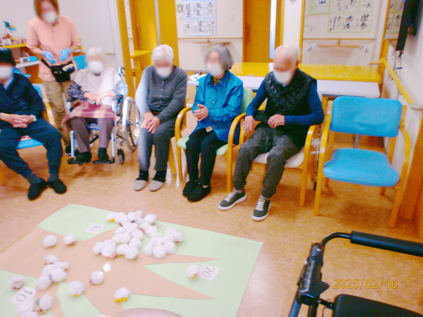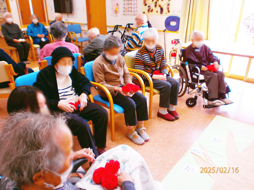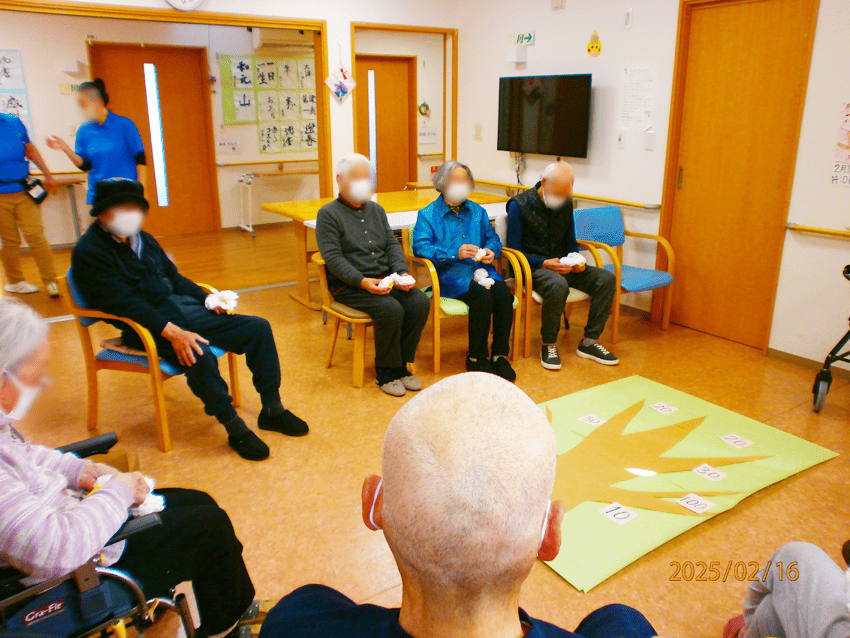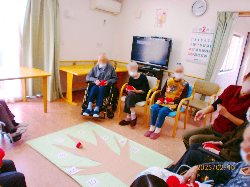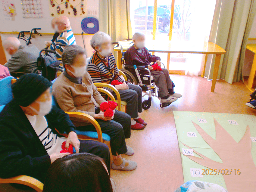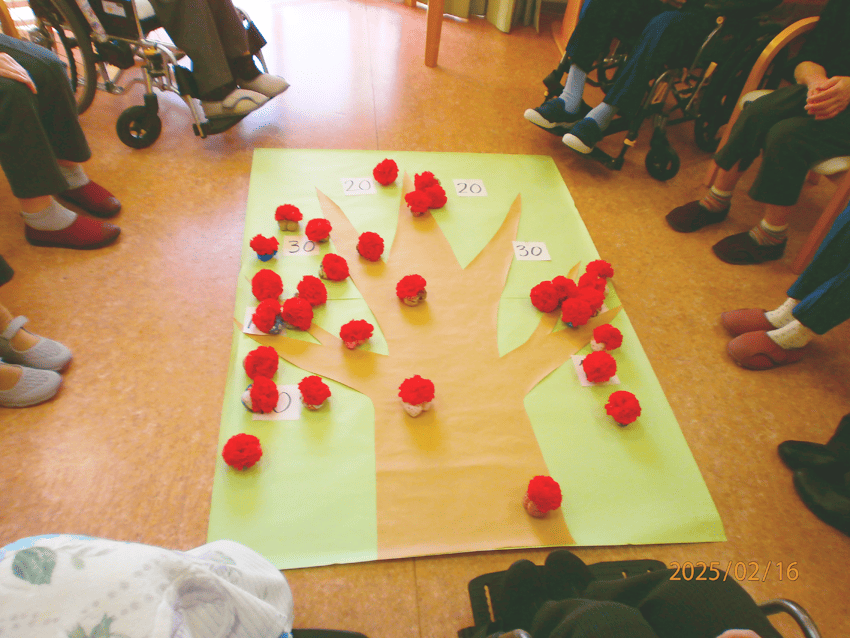 こすもす園ではいち早く春を迎えたく「枯れ木に花を咲かせましょう」と題し、2チームに分かれ得点で競うゲーム形式で2月の行事をさせていただきました。
