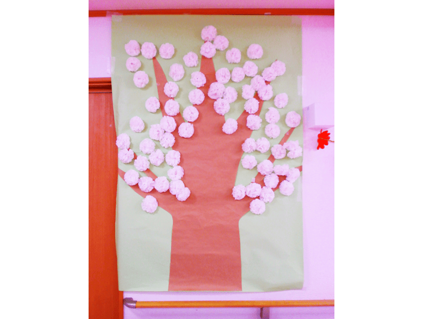 後日、利用者様が使用した花を的に貼付け壁に飾り、満開に咲いた花を眺め春を感じて頂いています。