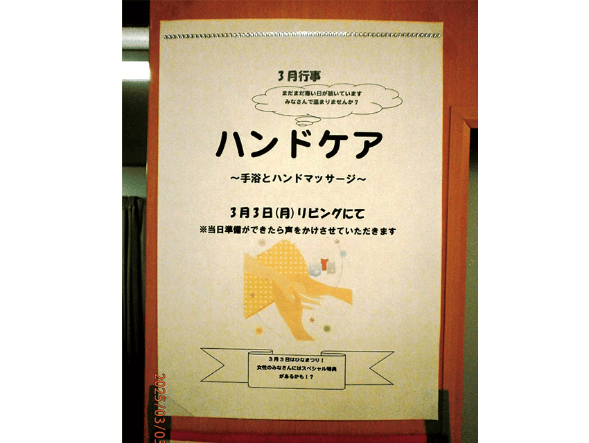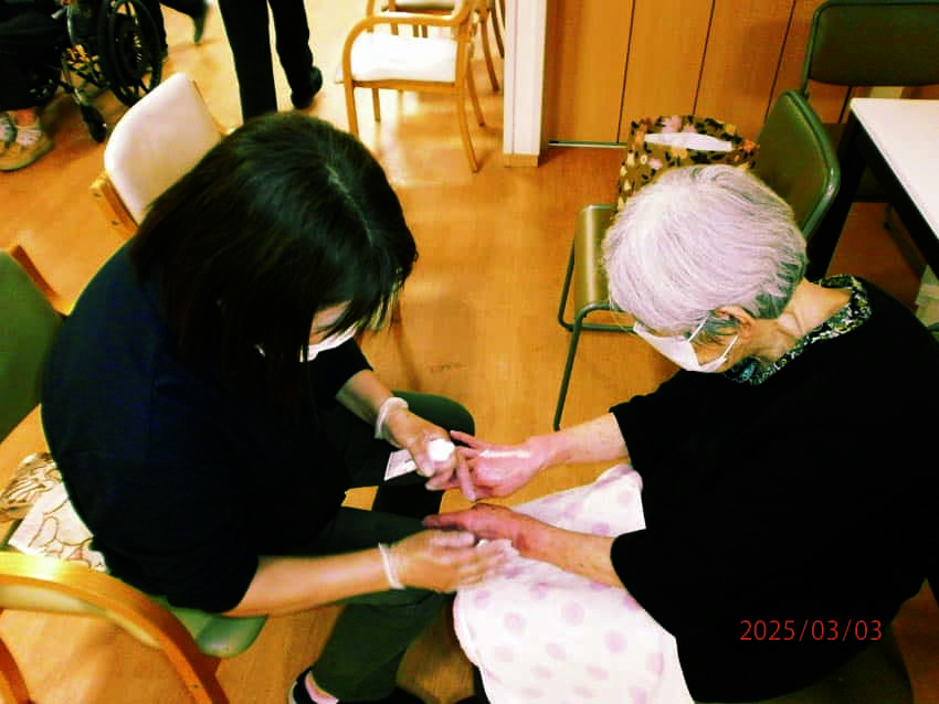 3月とは言えまだまだ寒い日が続いていたある日。3月行事「ハンドケア」を行いました。