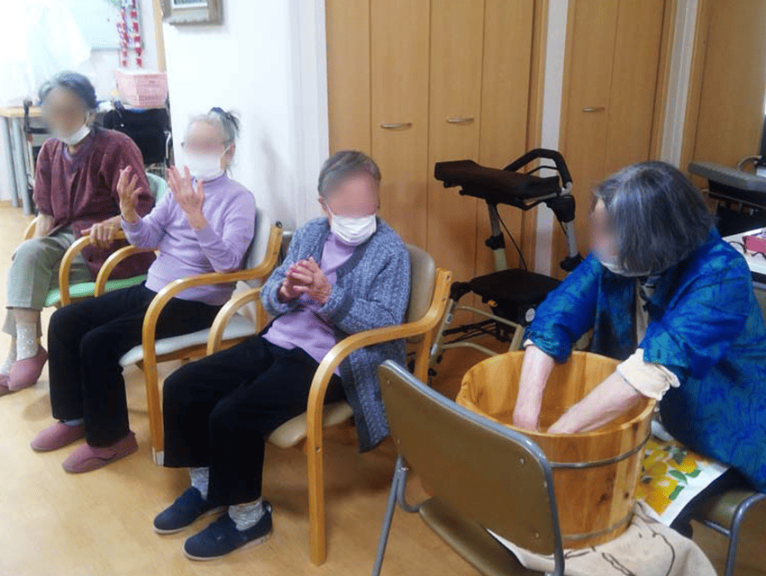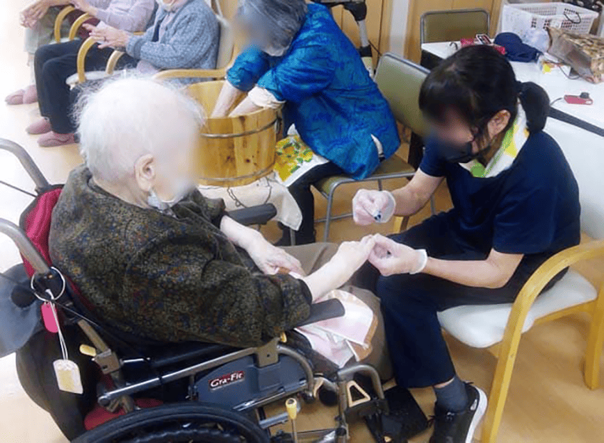 当日は職員が蔵王の鎌倉温泉からお湯を汲んできて、そのお湯で手浴を行い、その後はクリームをつけてマッサージを行いました。そしてこの日は3月3日のひな祭りの日。女性の皆さまにはスペシャルサービスとしてマニキュアと顔パックのフルコースを味わっていただきました♪