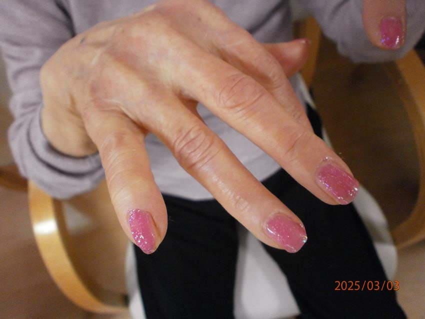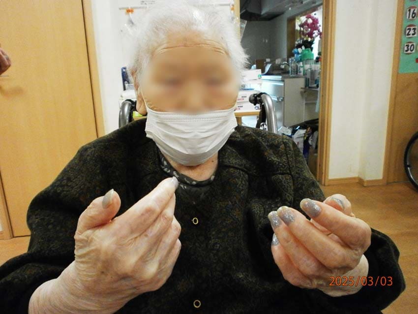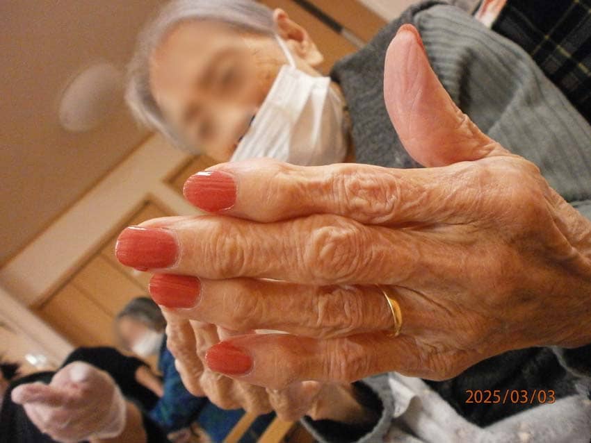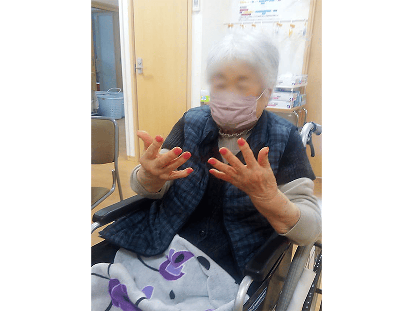 まもなく100歳をむかえられるN様が「30歳は若返って70歳になったわ」と話されると周りの皆さまからは笑い声が♪また、S様に「旦那様が面会にいらっしゃったら驚かせましょう!」と声を掛けると「これ以上惚れ直されると困るわ〜」と言いながら思わずニヤリ♪その可愛らしい表情に職員も癒されてしまいました。マニキュアを塗った皆さまはお互いに見せあって「あなたの色ステキね」「似合ってるわよ」とおしゃべりにも花が咲き、こすもす園の女子会は大盛り上がりでした!