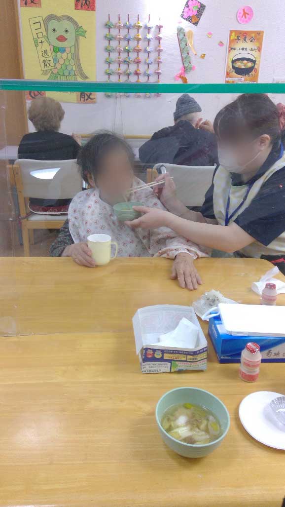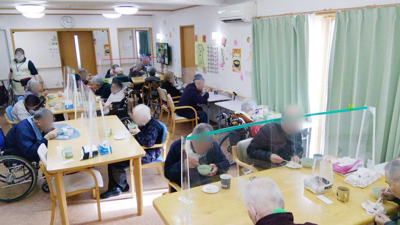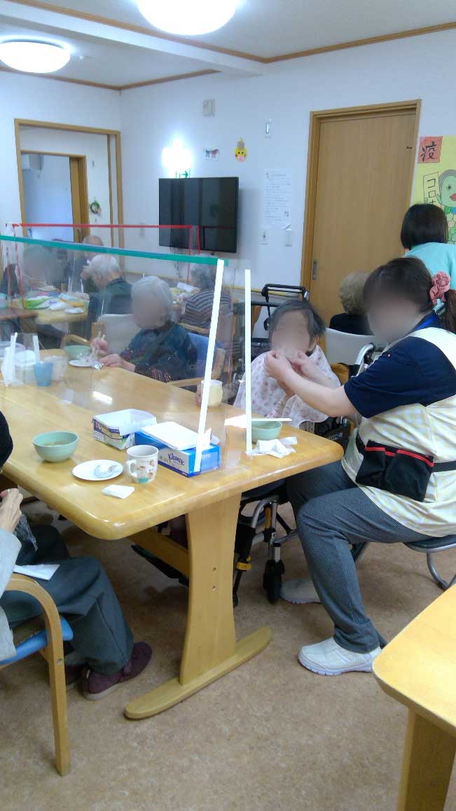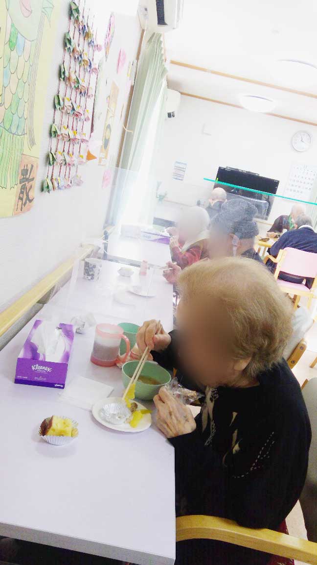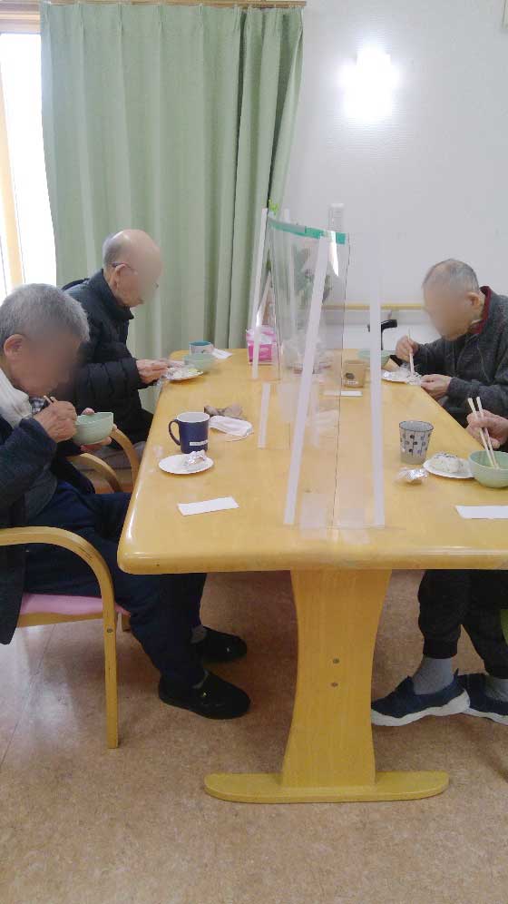 今月は秋の味覚を堪能していただきたく「芋煮会」を実施いたしました。普段はなごみ館、むつみ館別々のお食事ですが、この日は換気等感染対策を行いながら皆様一堂に会し美味しく召し上がっていただきました。