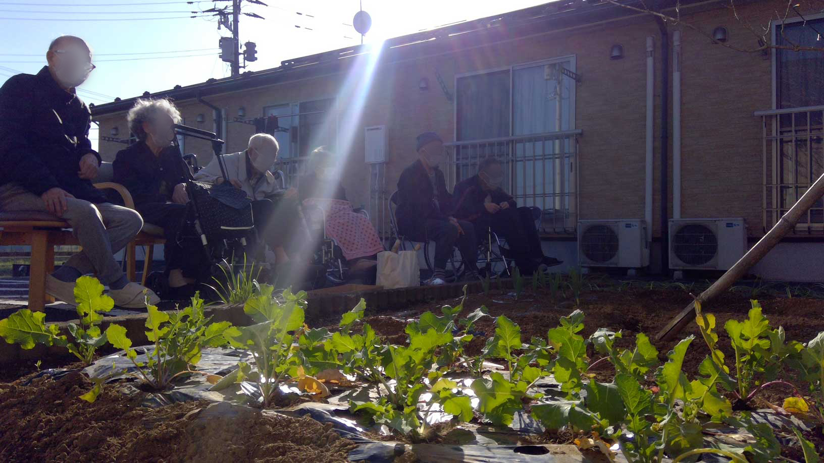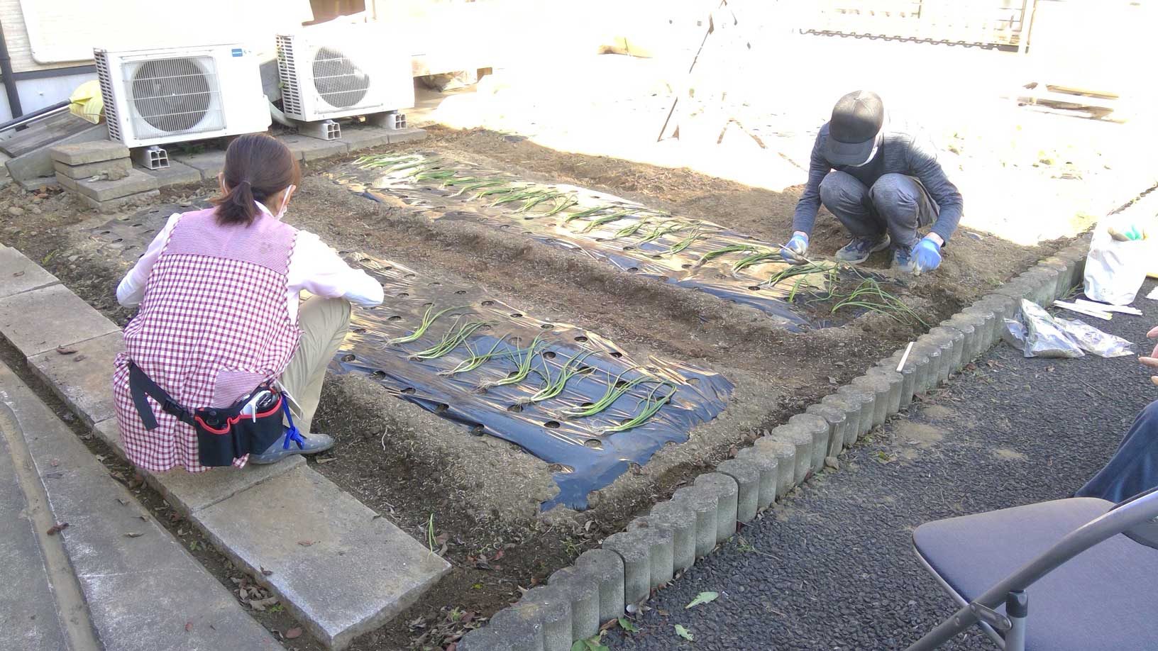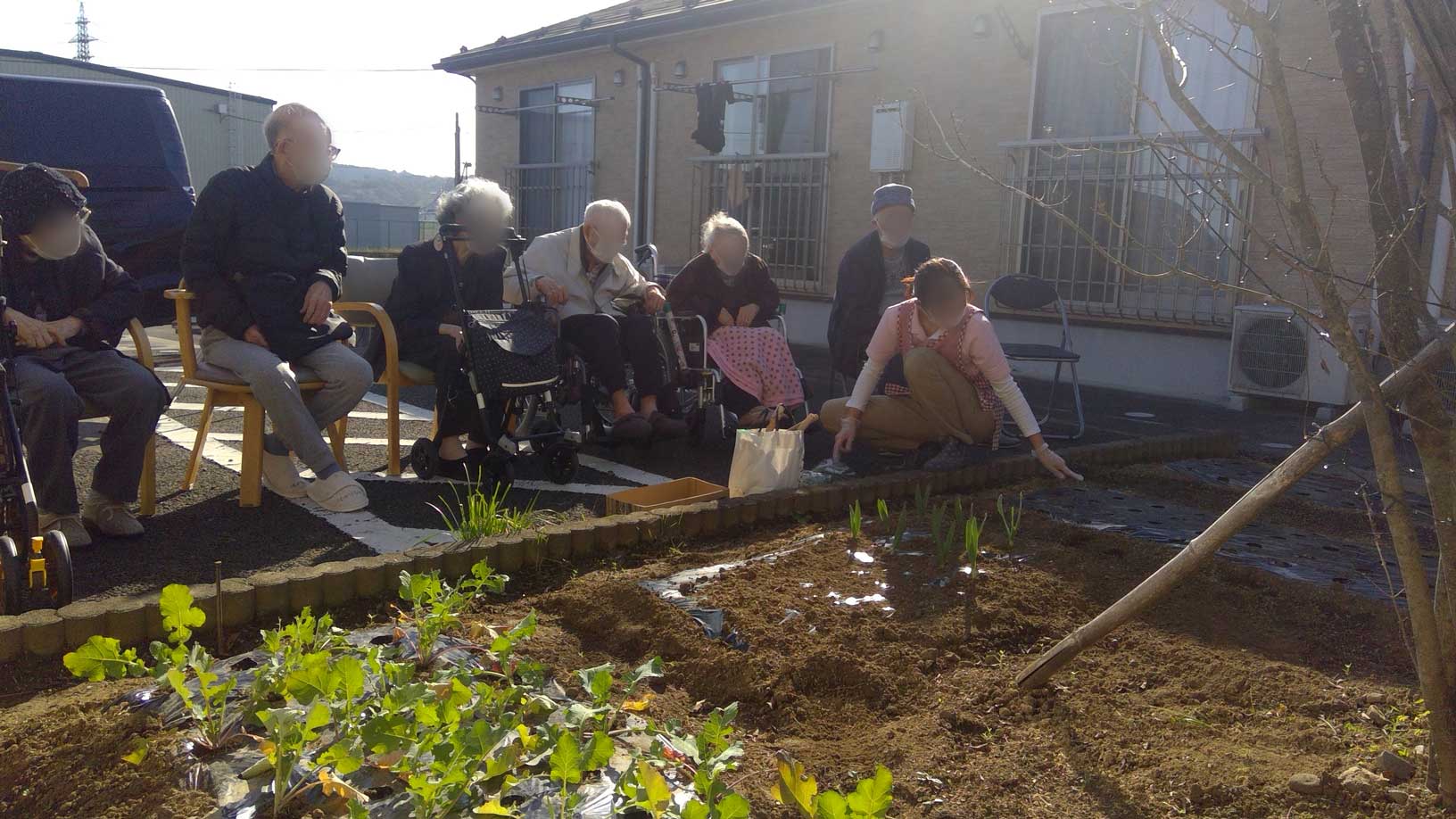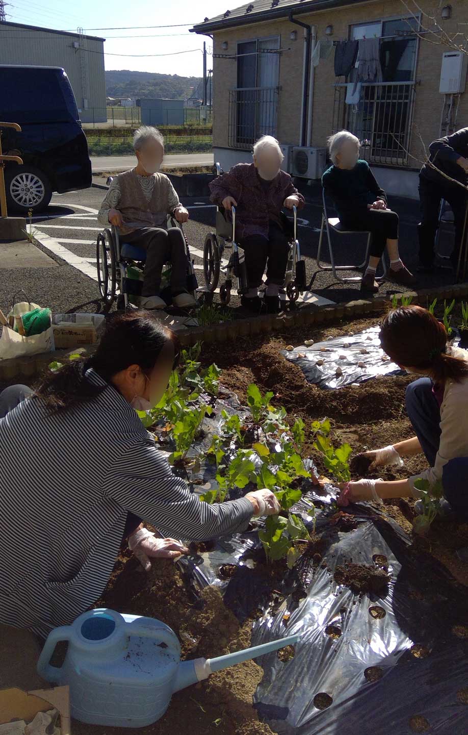 先日耕した畑に「玉ねぎ」「ニンニク」「あぶらな」の種と苗を植えました。 農園長がしっかりとマルチも行い利用者様と一緒に植えていきました。皆様お若いころの経験が豊富で「そっちさ水かけろ」「ほいってわ(それでは)倒れっから、もっと深く埋めねきゃなんね」等々あっちこっちから声が上がりました。 歳を重ね、身体は以前のように動かせなくなっても、経験と知識を存分に発揮されているお姿は『さすが!!』の一言に尽きます。