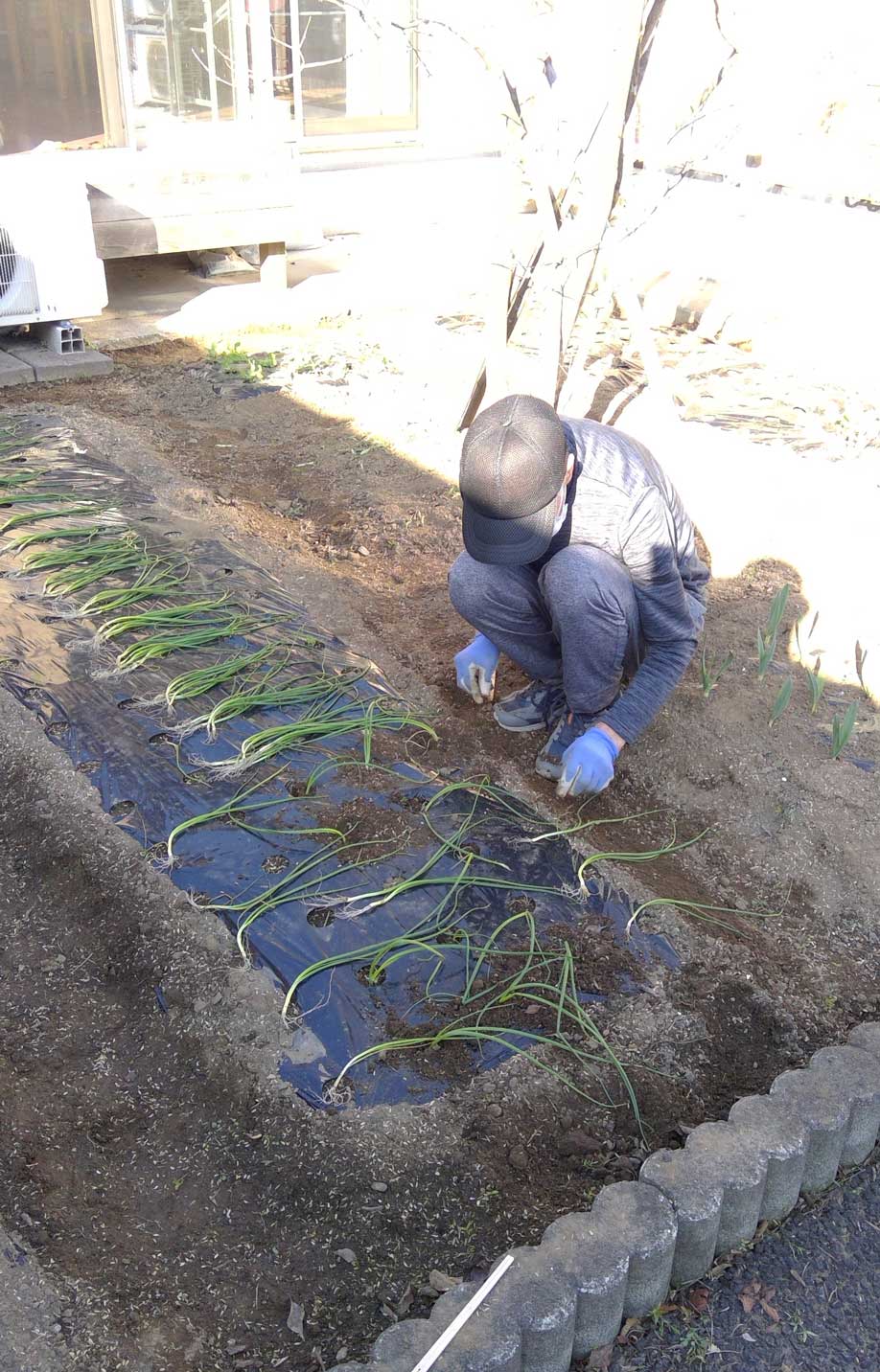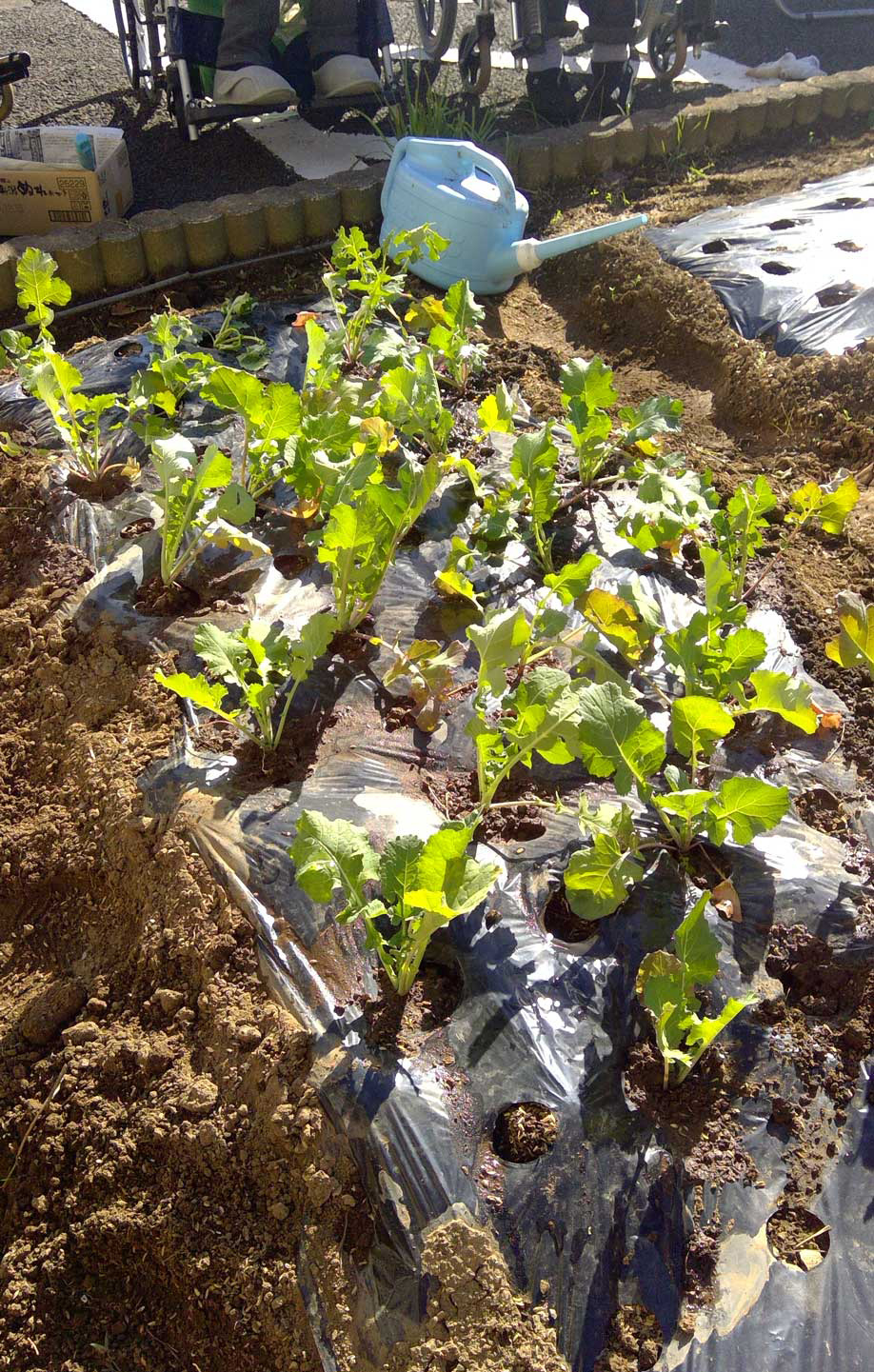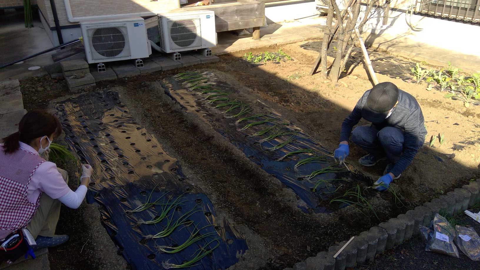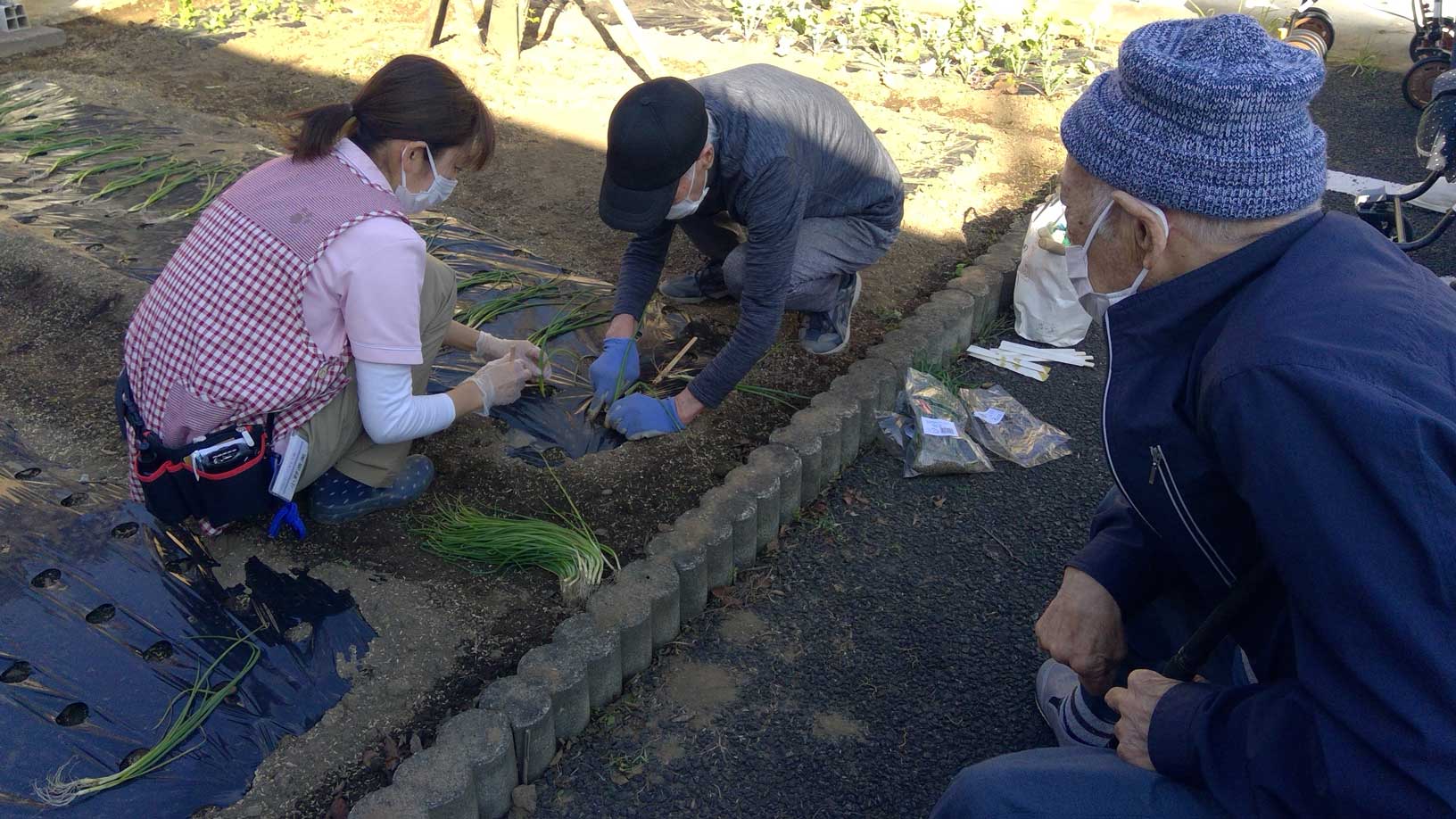 先日耕した畑に「玉ねぎ」「ニンニク」「あぶらな」の種と苗を植えました。 農園長がしっかりとマルチも行い利用者様と一緒に植えていきました。皆様お若いころの経験が豊富で「そっちさ水かけろ」「ほいってわ(それでは)倒れっから、もっと深く埋めねきゃなんね」等々あっちこっちから声が上がりました。 歳を重ね、身体は以前のように動かせなくなっても、経験と知識を存分に発揮されているお姿は『さすが!!』の一言に尽きます。