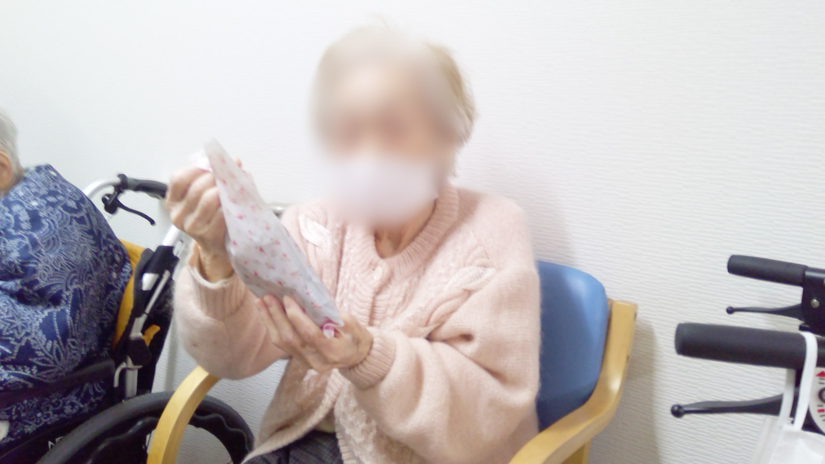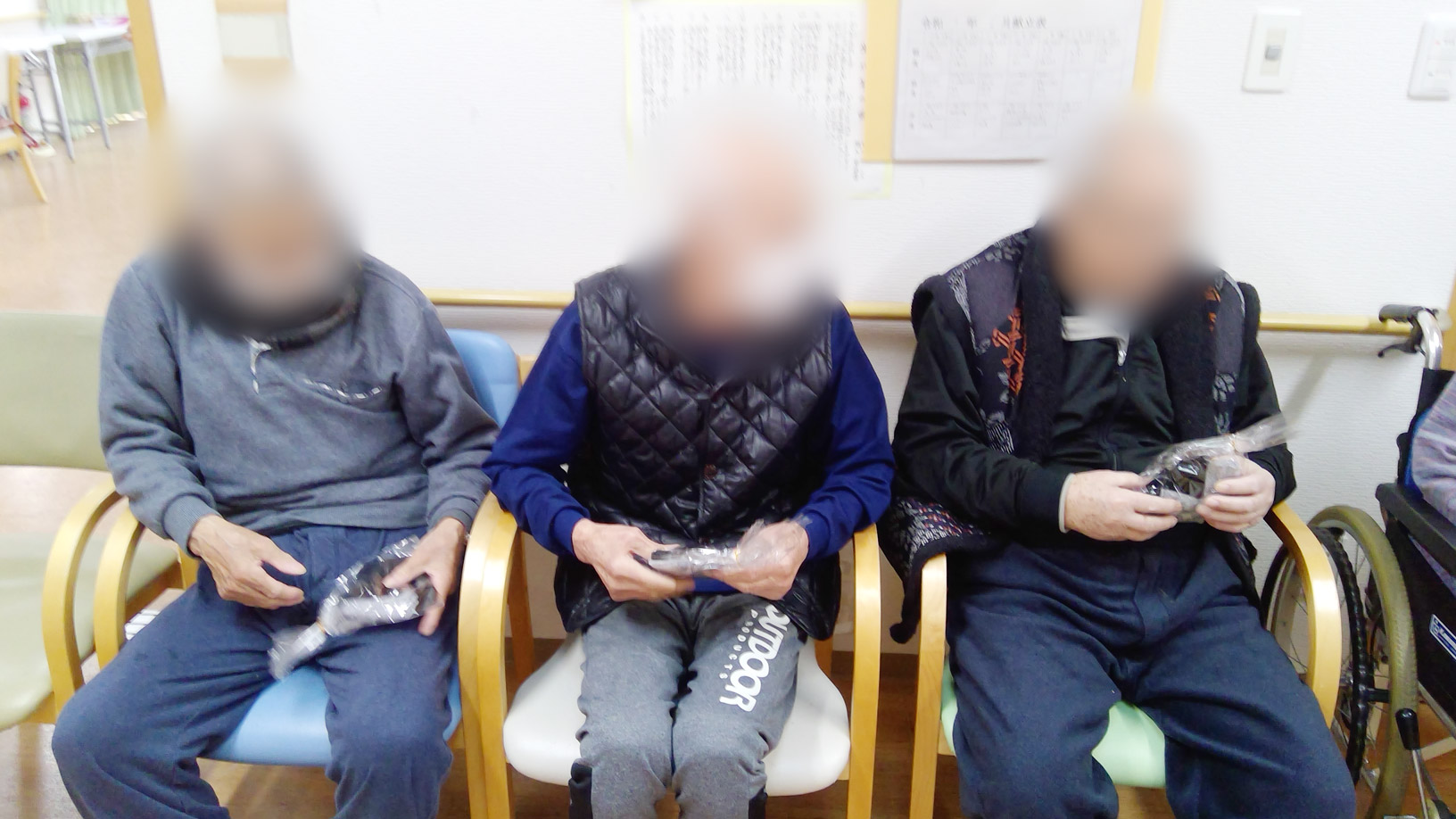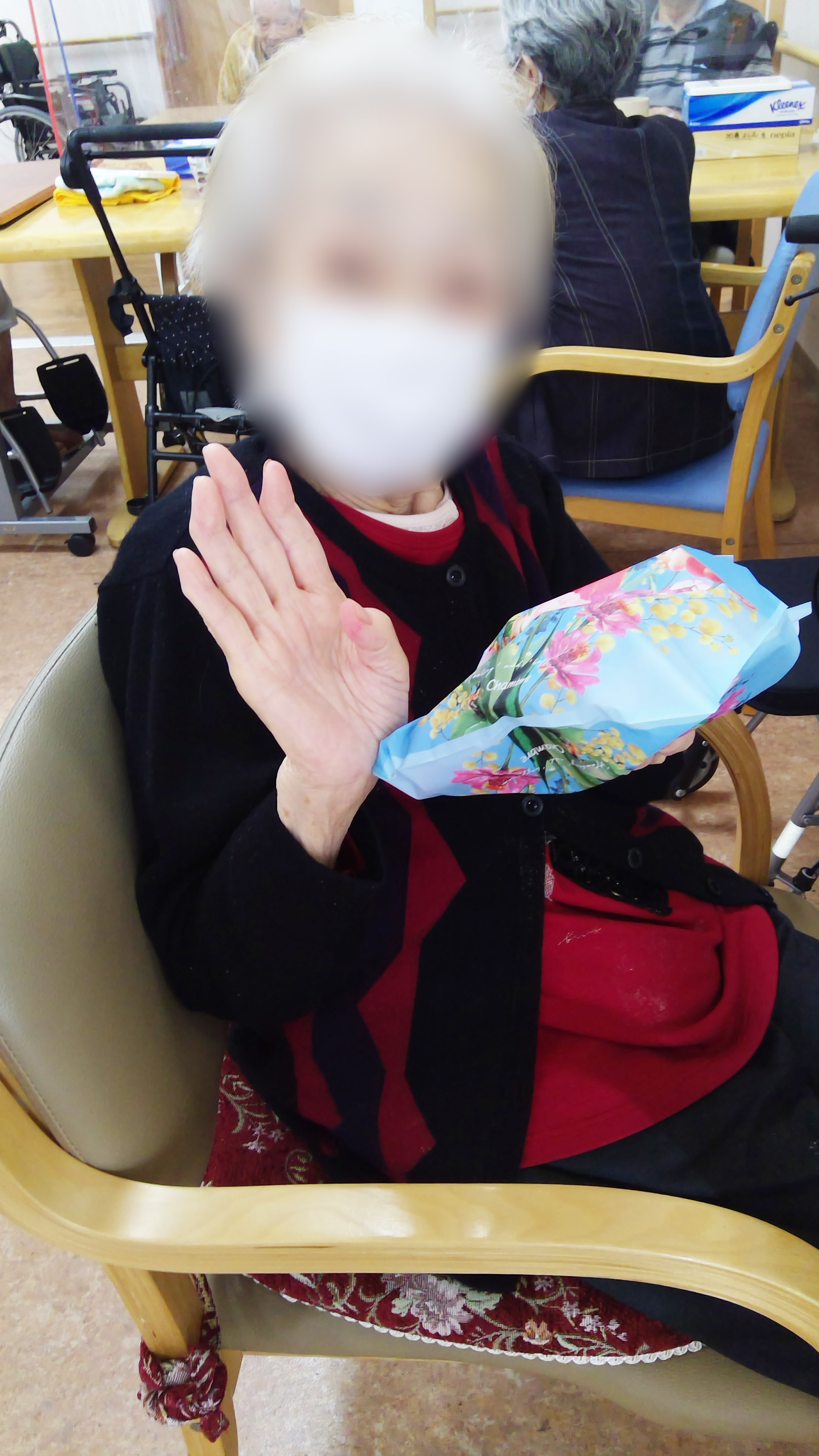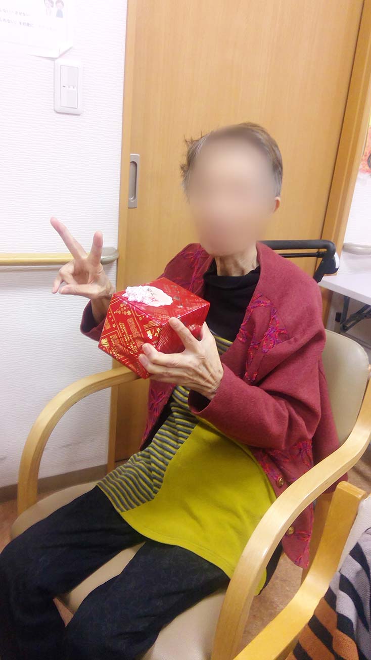 いつもはお部屋で過ごすことの多いK様ですが、誕生会のお声がけをするとご自分で身支度を整えられ、素敵なスカーフでおしゃれをされて参加してくださいました。S様はプレゼントのニット帽を大変喜んでくださり、翌朝には着用していてくださいました。W様は少し恥ずかしそうにされながらも、「俺はまだまだ元気なんだ」と他の方々に山登りのお話等、誇らしげにお話しされておりました。