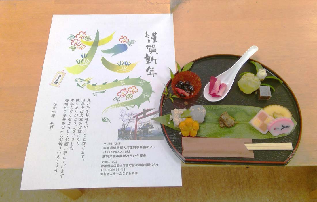 元日の朝食です。 「新春お祝い膳」 味はもちろん、見た目も美しく新春を彩ってくれました。皆様「きれいで食べるのがもったいないわ」「どこから手をつけたらいいかな?」「どこのお店に頼んだの?」と朝から驚きと喜びのお声が上がりました。