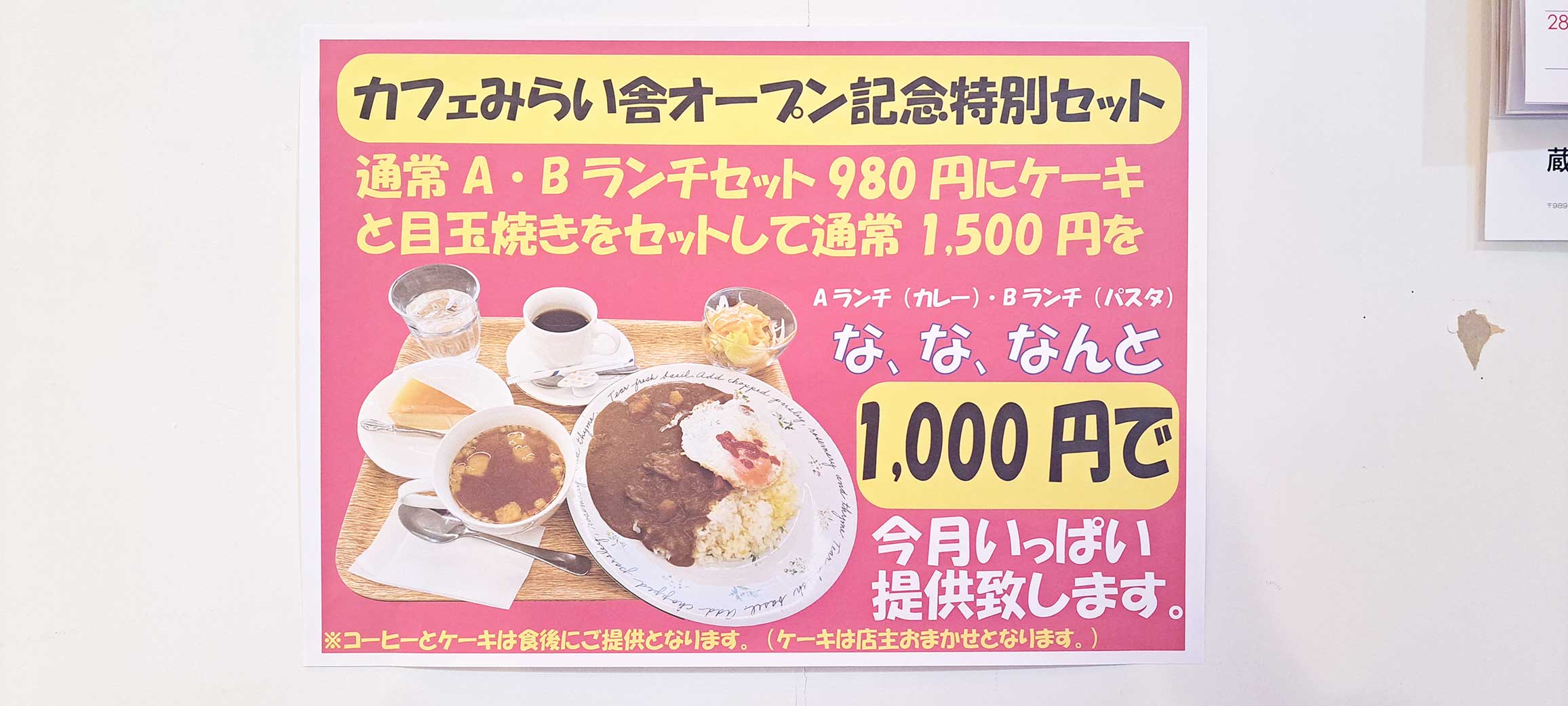 村田インターチェンジから蔵王方面へ向かう途中にあるジャックスビレッジの2階にあるカフェです。1回には古着屋さんがあります。 実はこのカフェのオーナーさんはこすもす園の介護スタッフのお父様が運営しております。