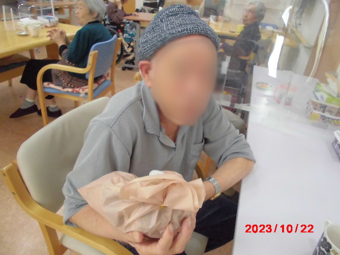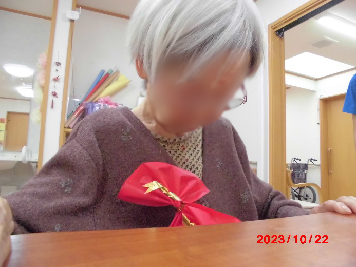 ただ、大変申し訳なかったのですが、8月と9月の誕生日会ではお祝い御膳とケーキのみで、プレゼントの準備が間に合いませんでした。コロナウイルス対策により職員多忙となってしまった為でした。その為、今回の誕生日会で8月と9月の誕生日だった利用者様へのプレゼントも用意しておりました。