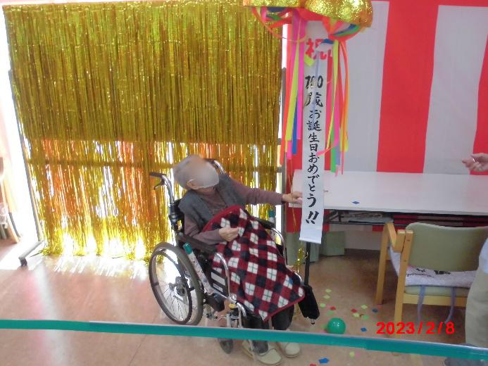 こすもす園では初の100歳を迎える利用者様のお祝い会が催されました。 こすもす園初ということもあり、会場の飾りつけやお祝い会の内容など手探りの準備となりましたが、職員も張り切って準備しました。